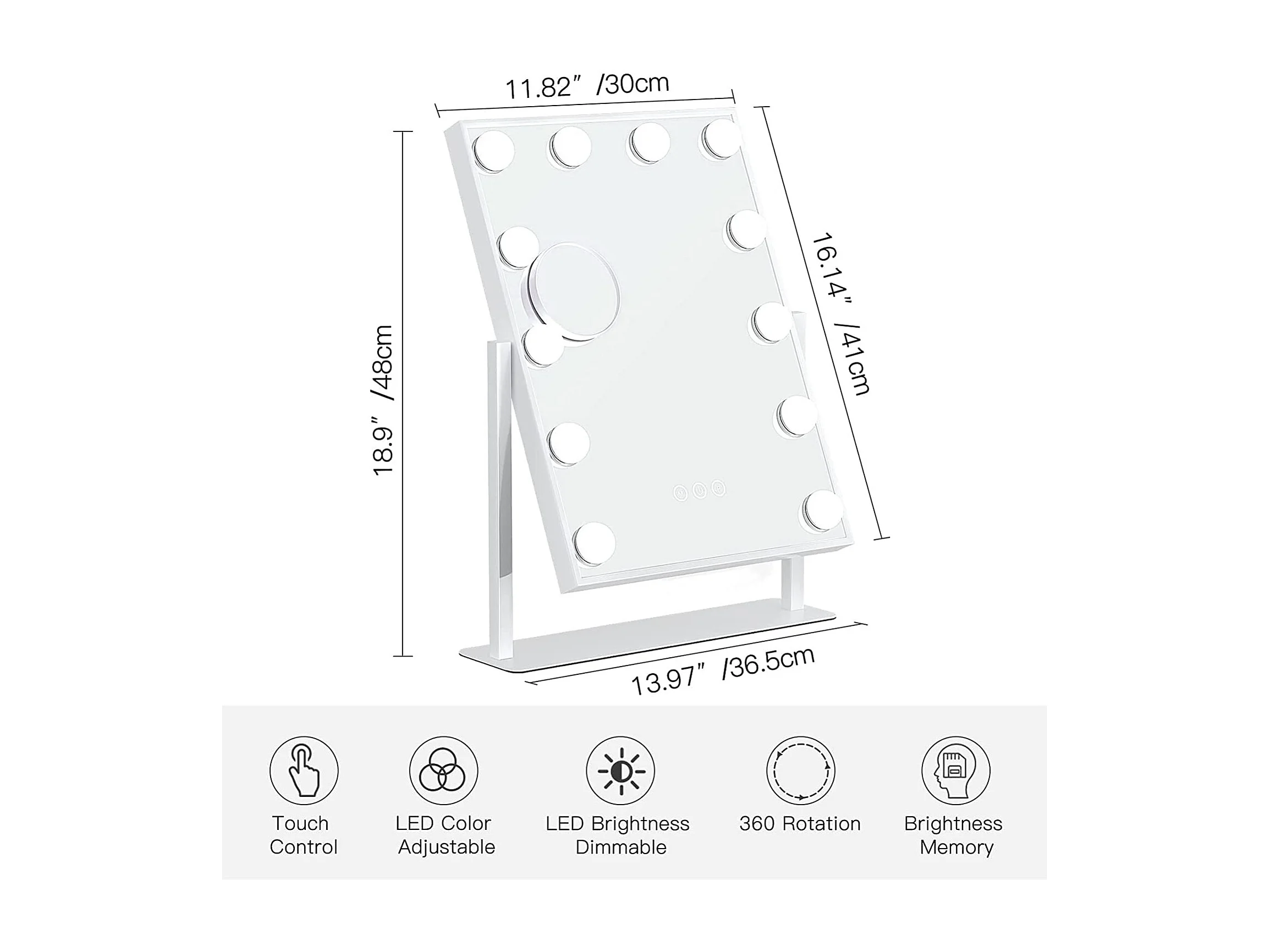 Hollywood make-upspiegel met 12 leds, 30 x 41 cm, 360° draaibaar, 3 standen, instelbare helderheid, touchbediening, ideaal voor de kaptafel, Wit