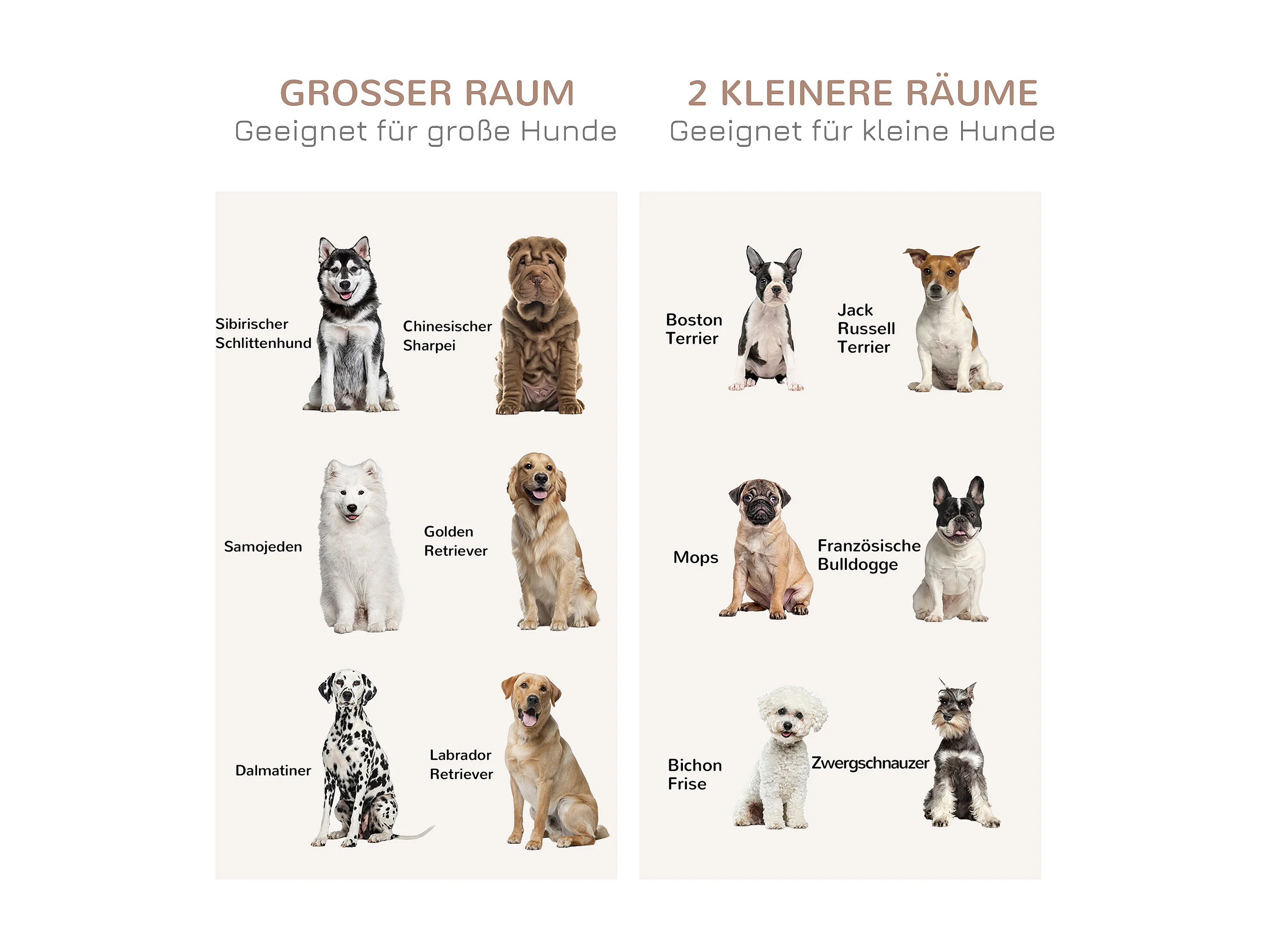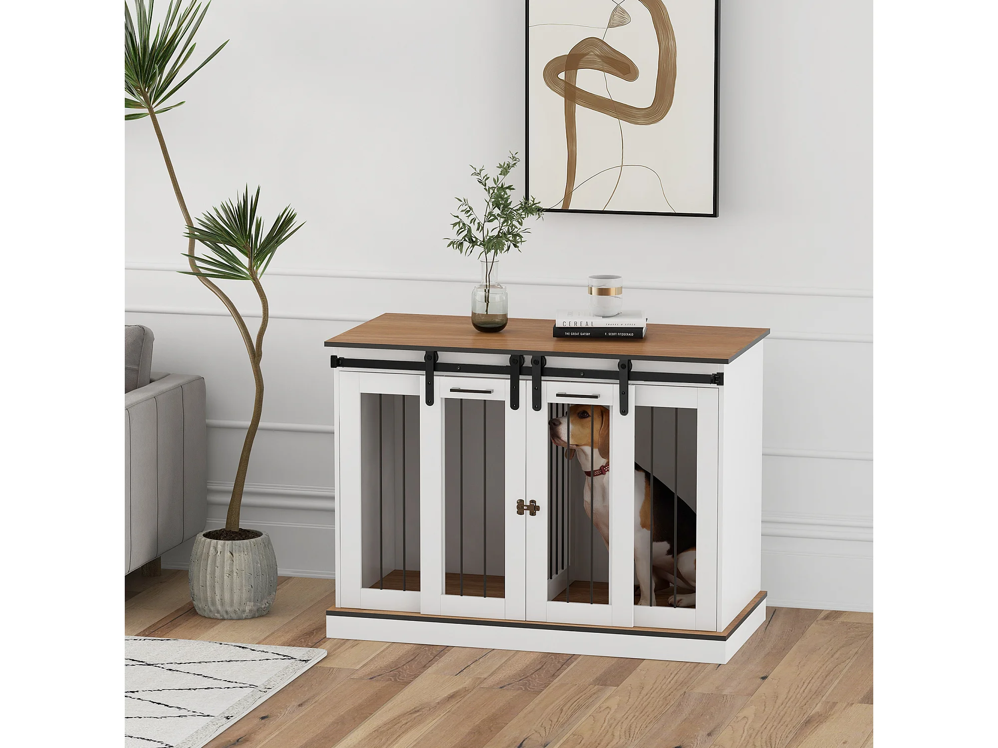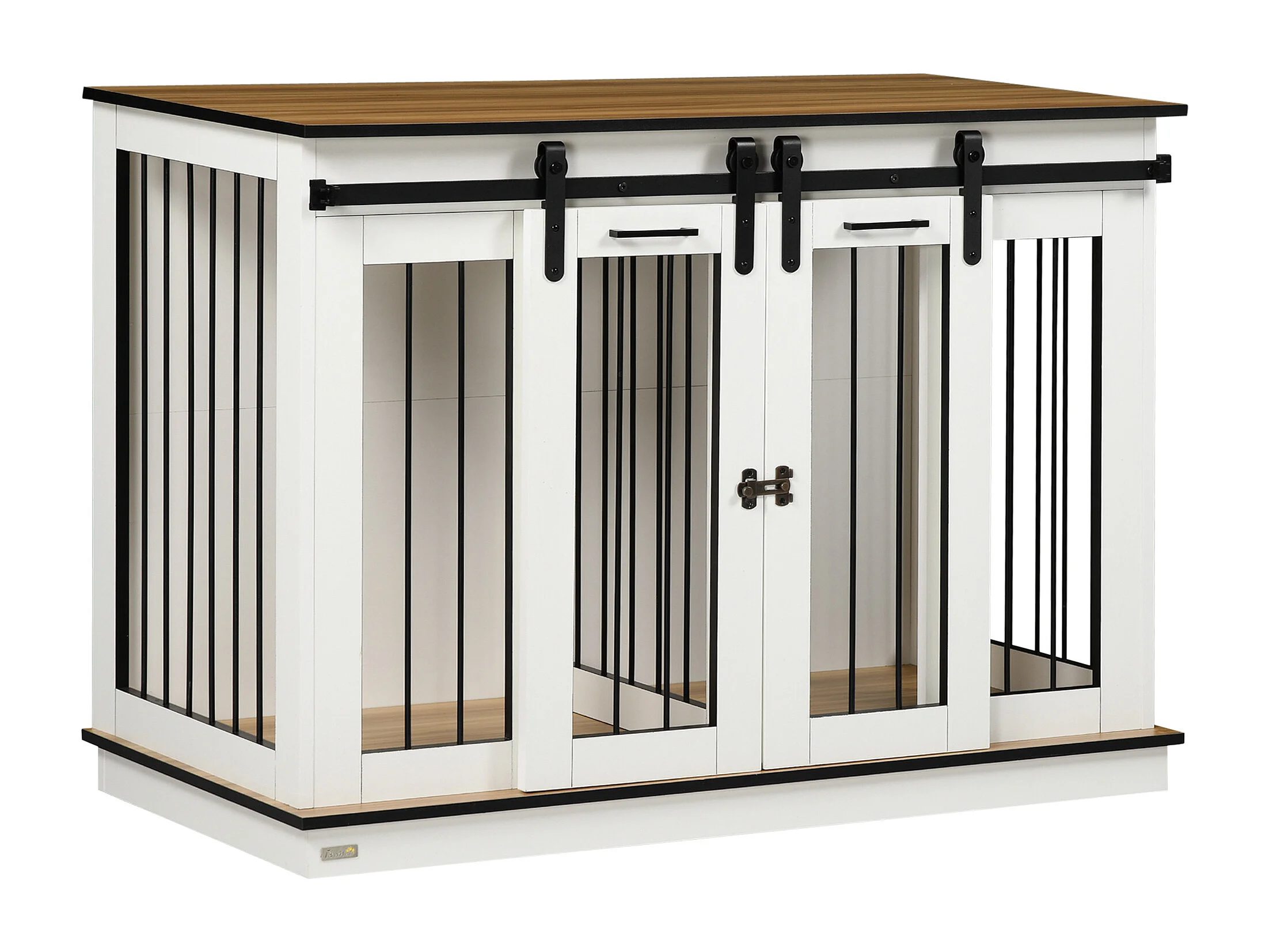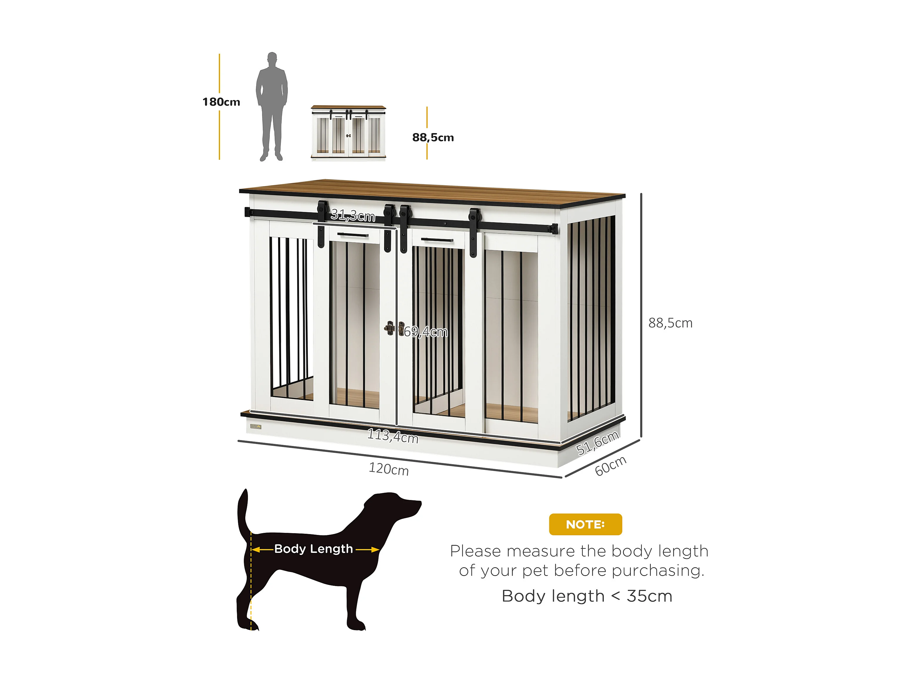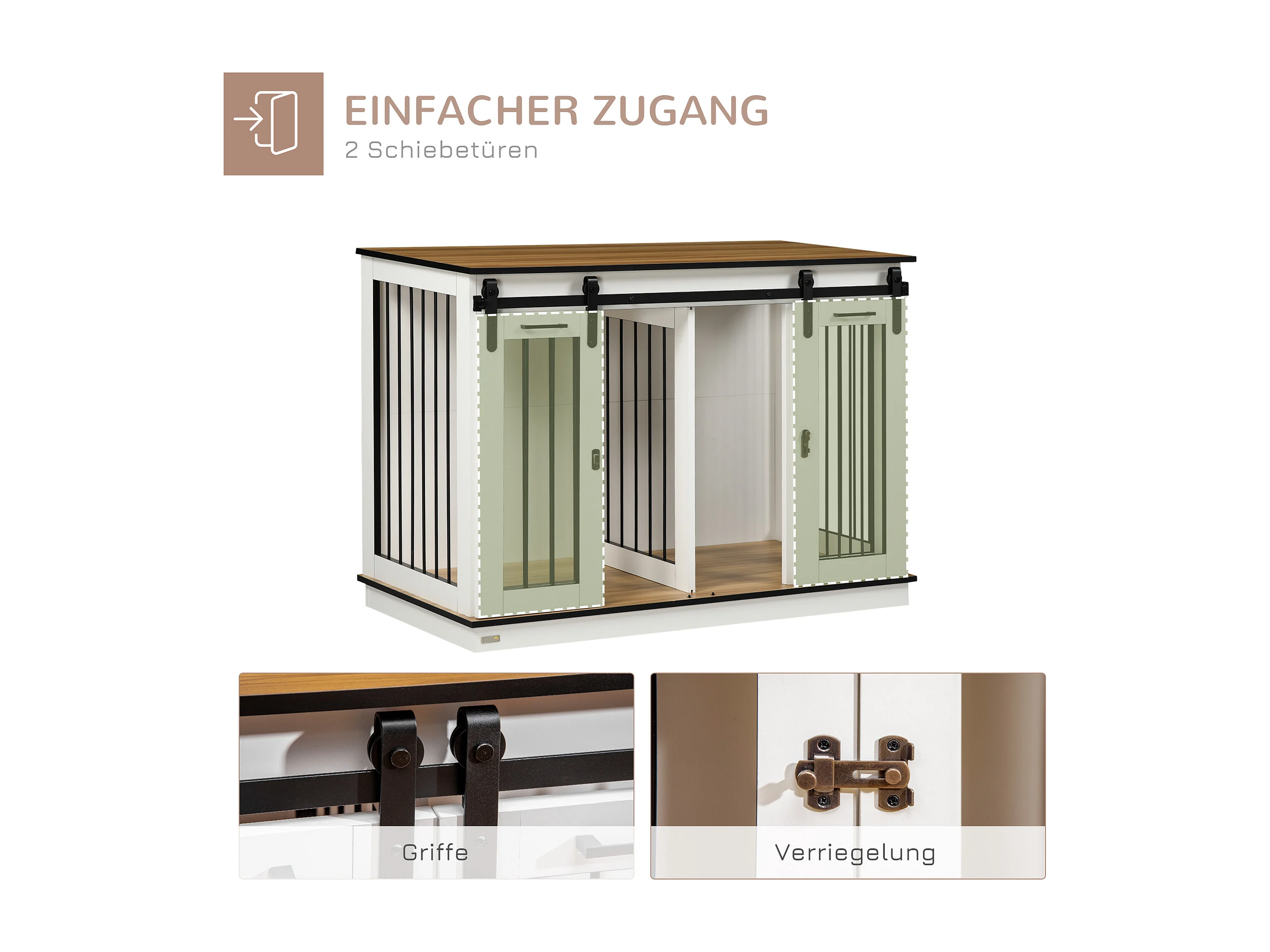 Hondenbench met twee compartimenten, rustiek design, hout, wit, met dubbele deur (120x60x88,5 cm)