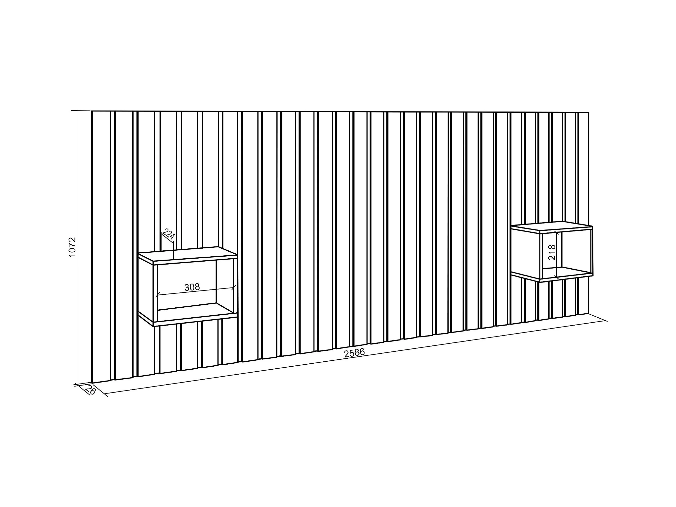Hoofdeinde, Nachtkastjes, 258x107x3cm, Bed van 150,160,180cm, Lamellenwand, Cement