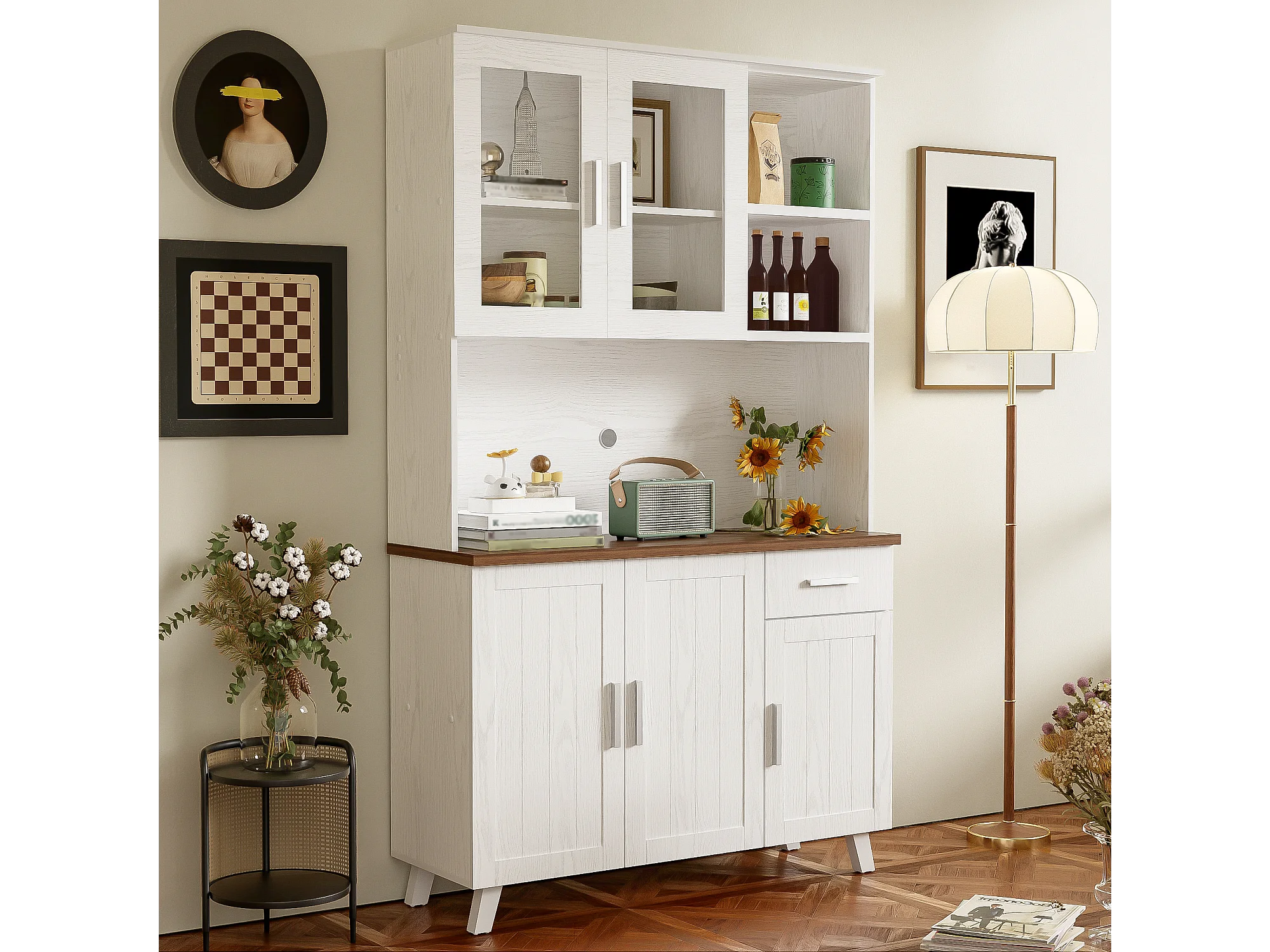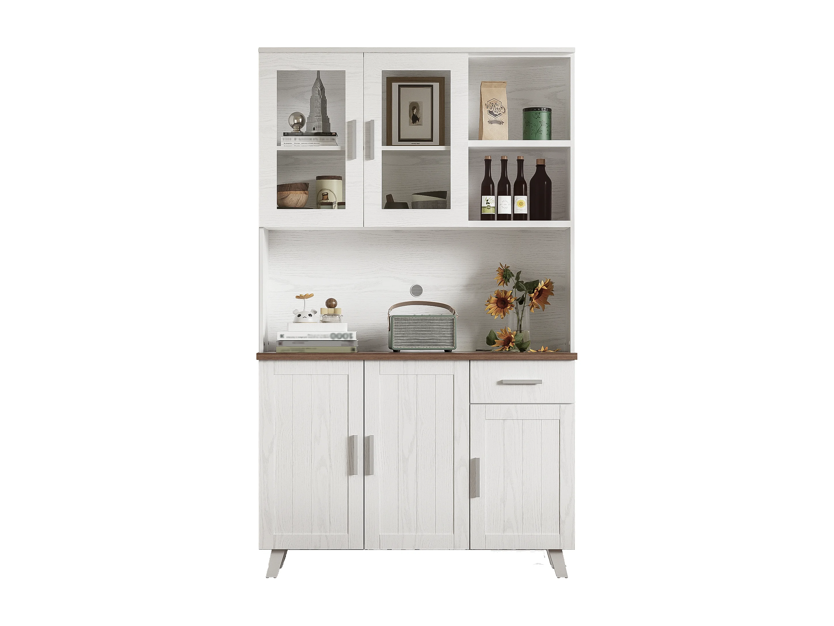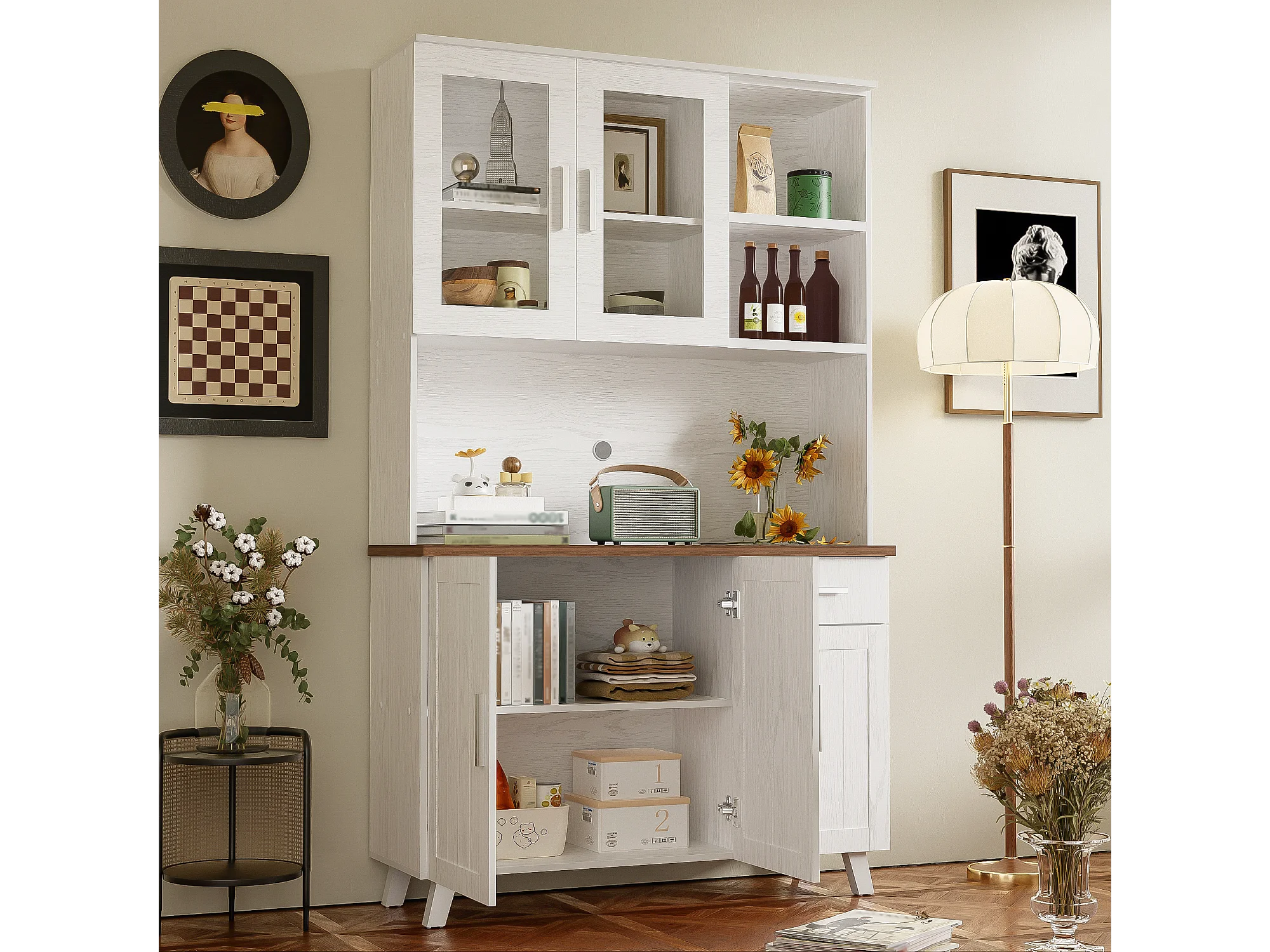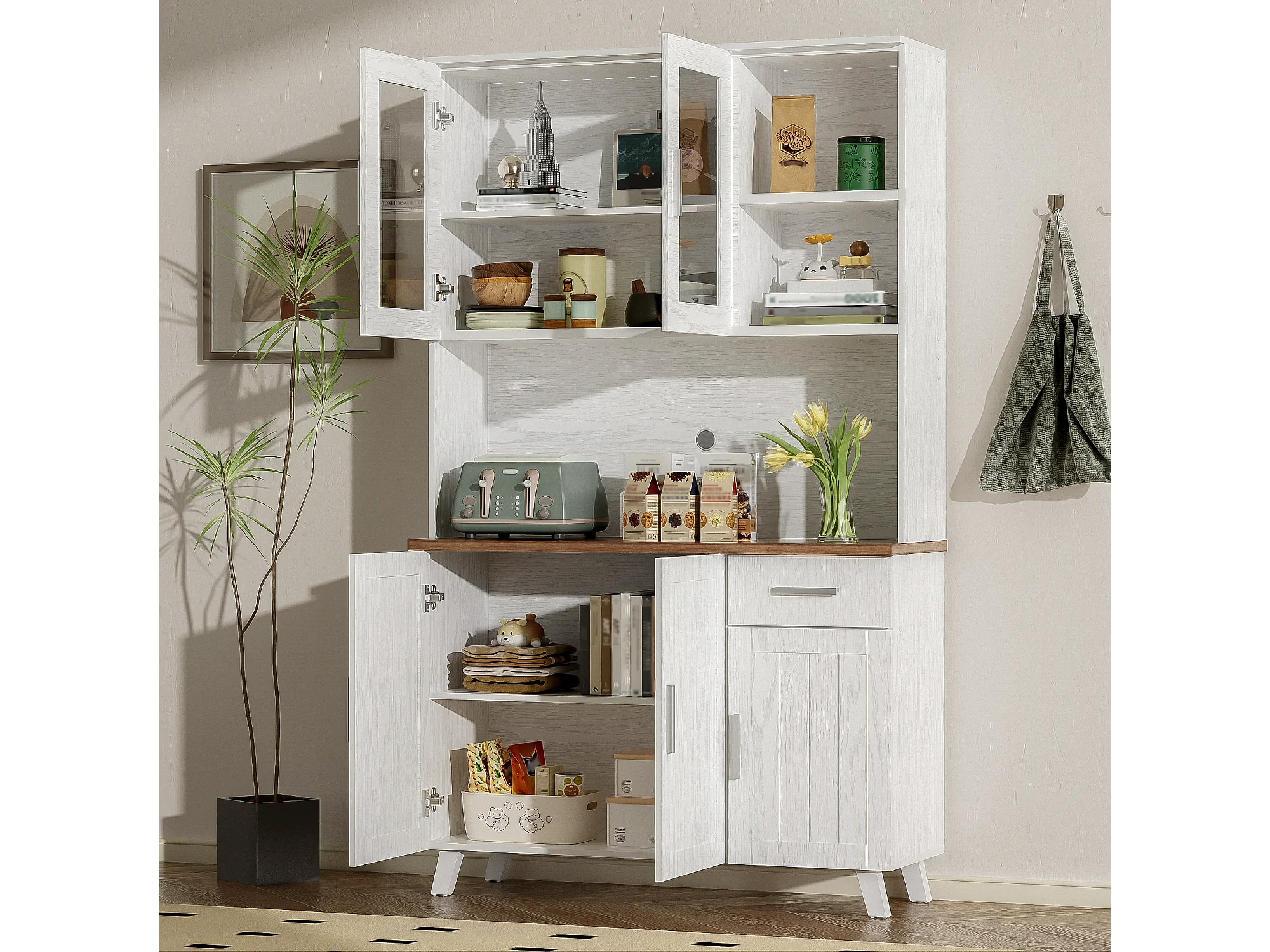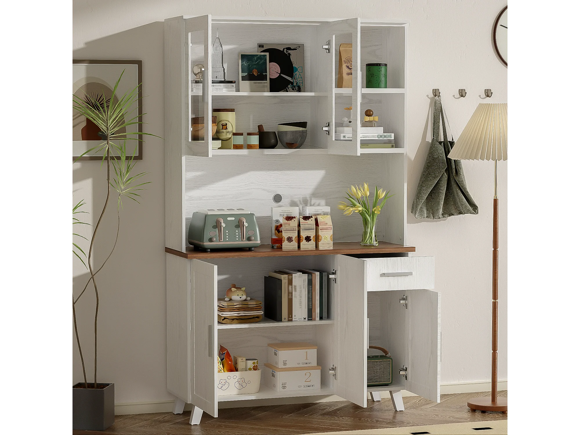 Hoog dressoir met 5 deuren, 1 lade en open vakken - 114 x 40 x 190 cm - Spaanplaat - Wit