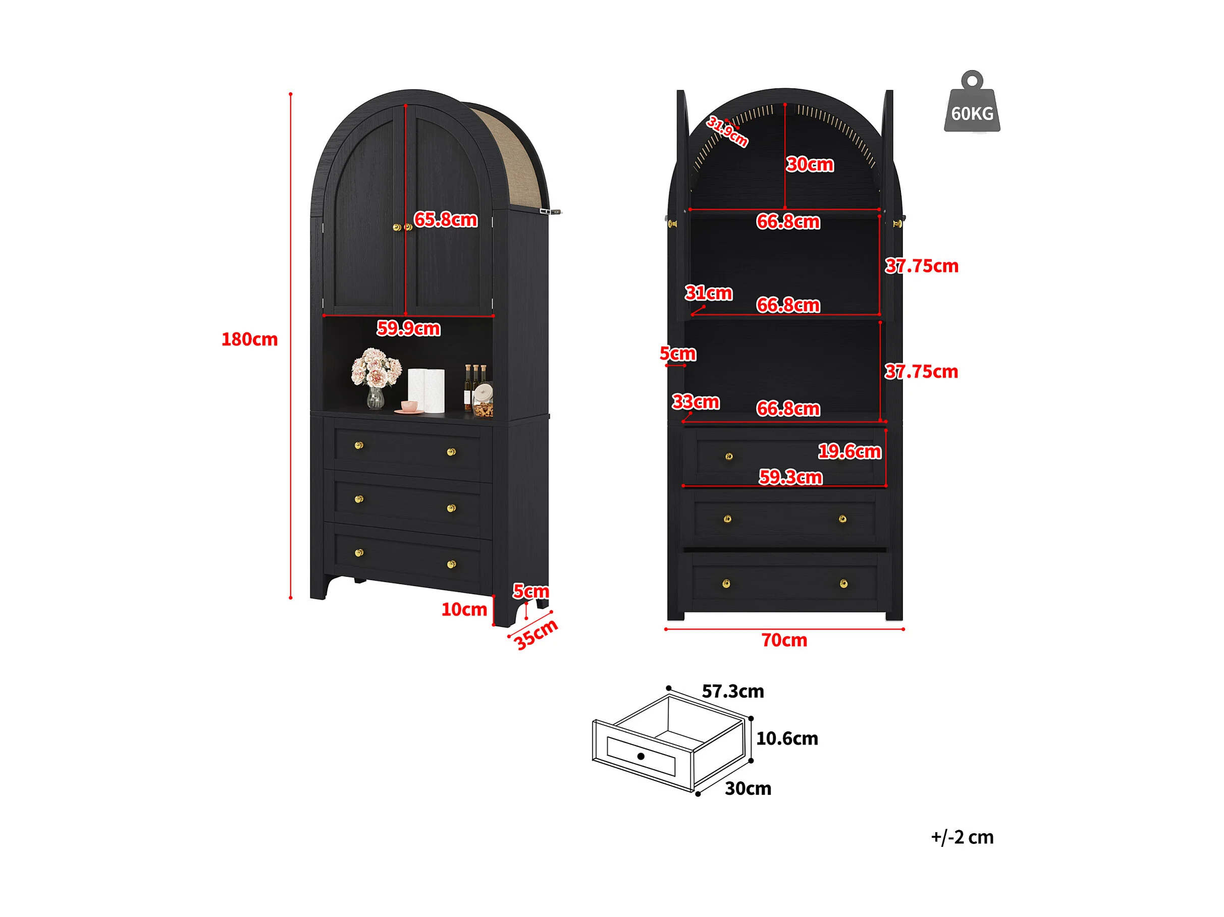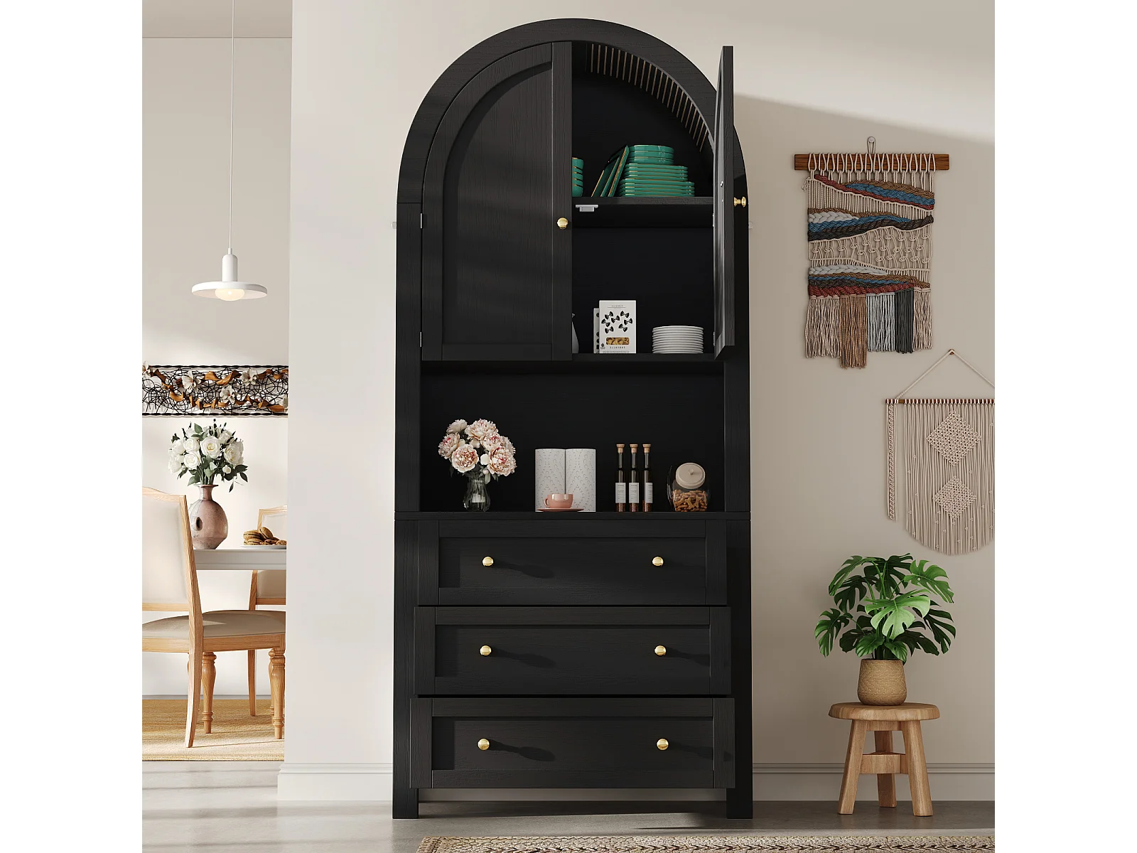Hoog dressoir met deuren en lades, open gebogen planken, zwart, meubel voor keuken of woonkamer