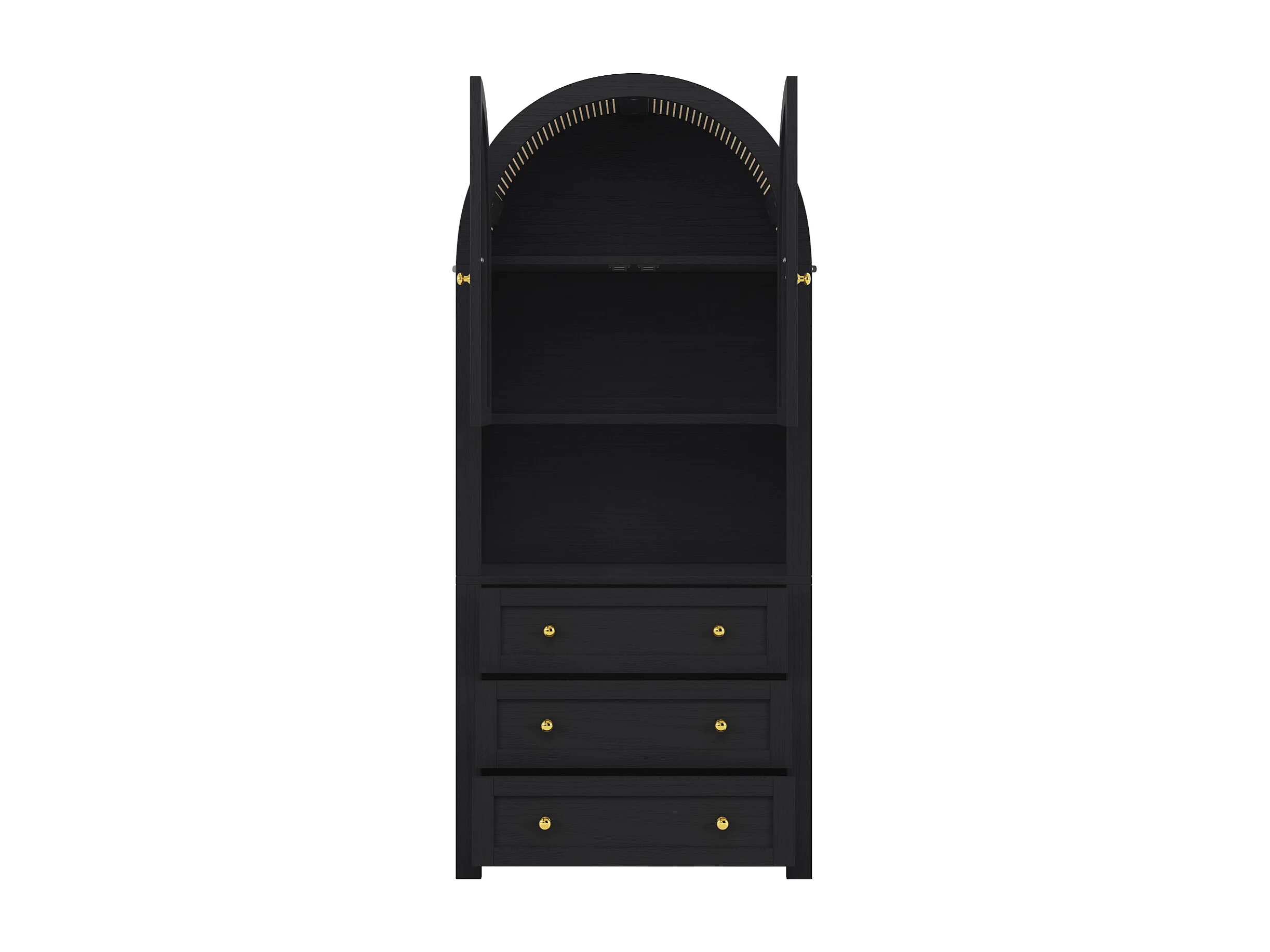 Dressoir met structuurpanelen, verstelbare planken en gouden versieringen, met zwarte lades