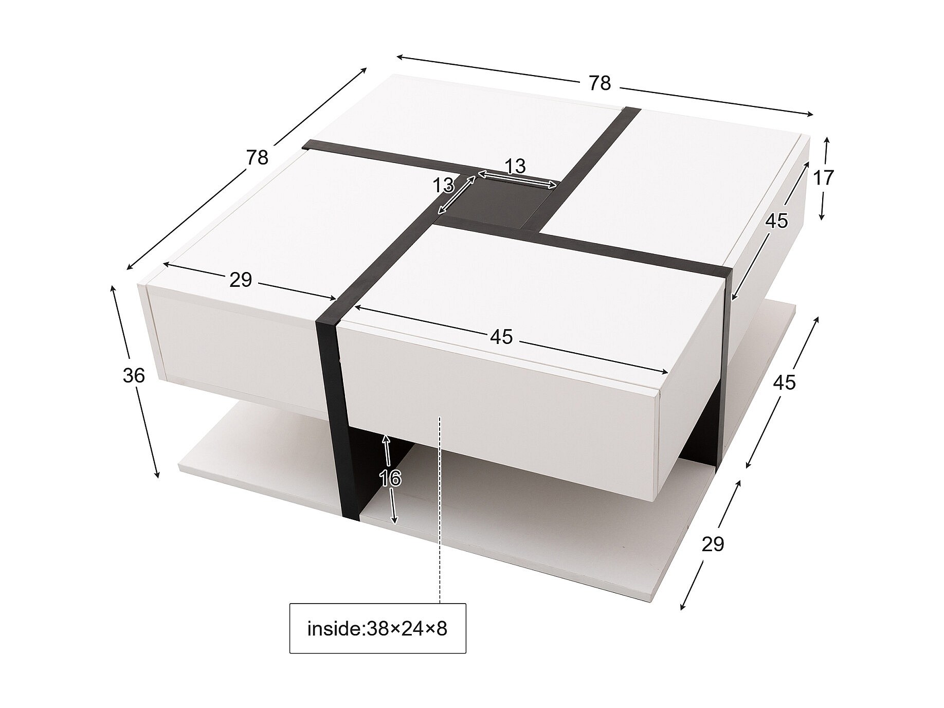 Hoogglans salontafel met 4 lades, unieke kleurcoördinatie en rechtlijnig design, opbergruimte eronder, 78 x 78 x 36 cm