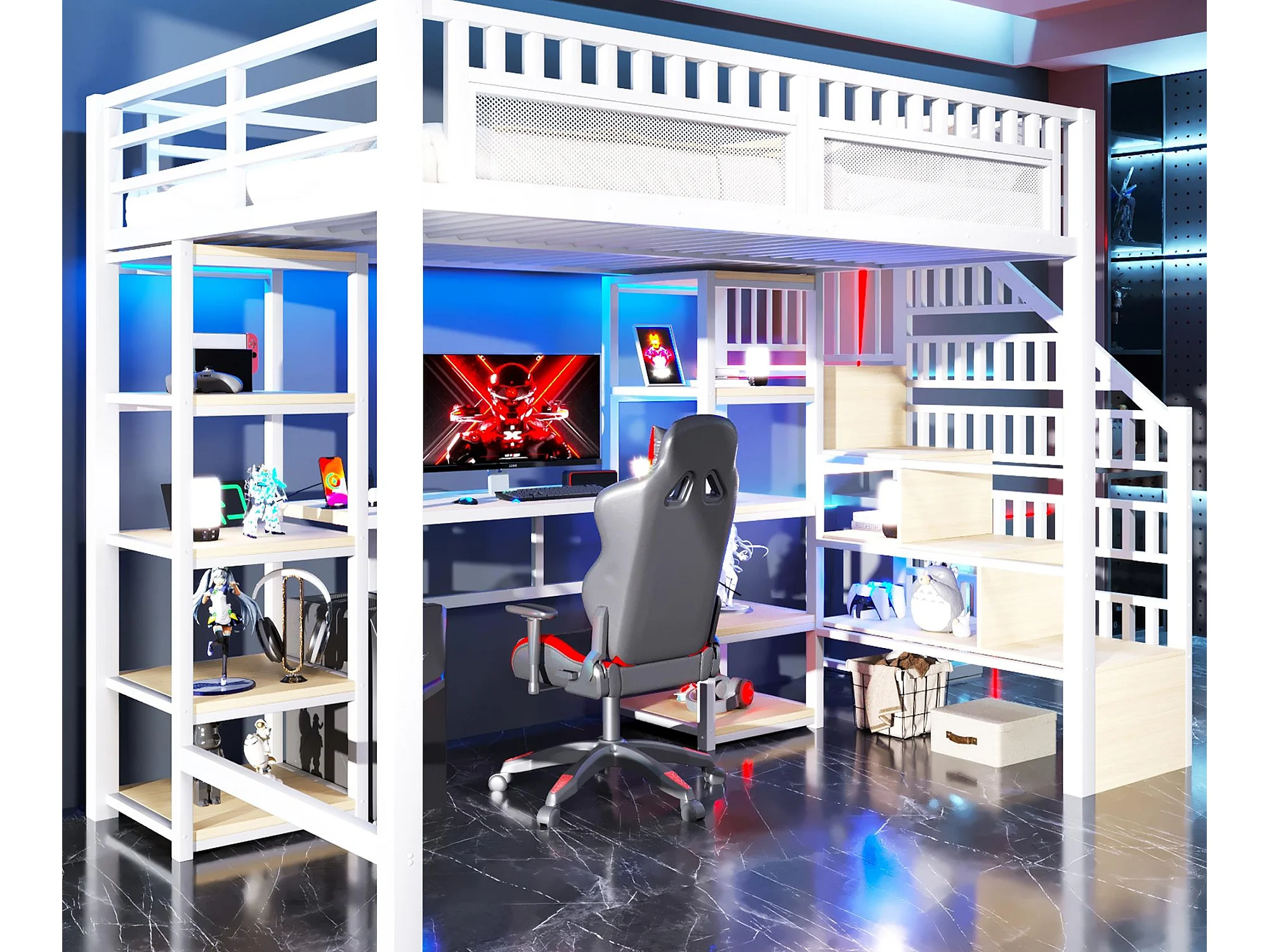 Hoogslaper 140x200 cm - Geïntegreerde opbergtrap - Ingebouwd bureau - LED-lichtstrip + USB-poort - wit (matras niet inbegrepen)
