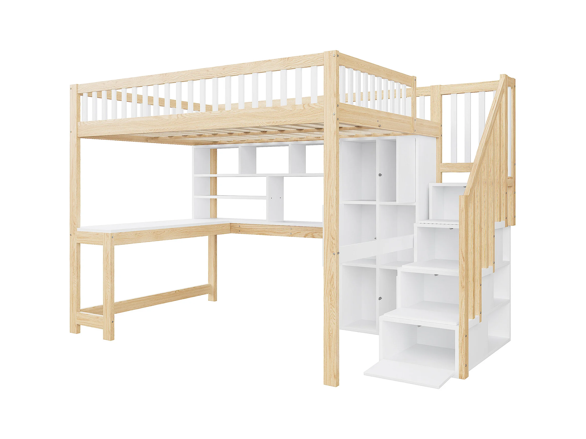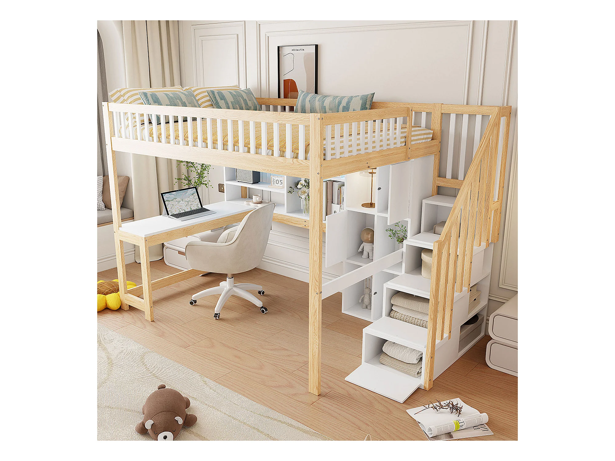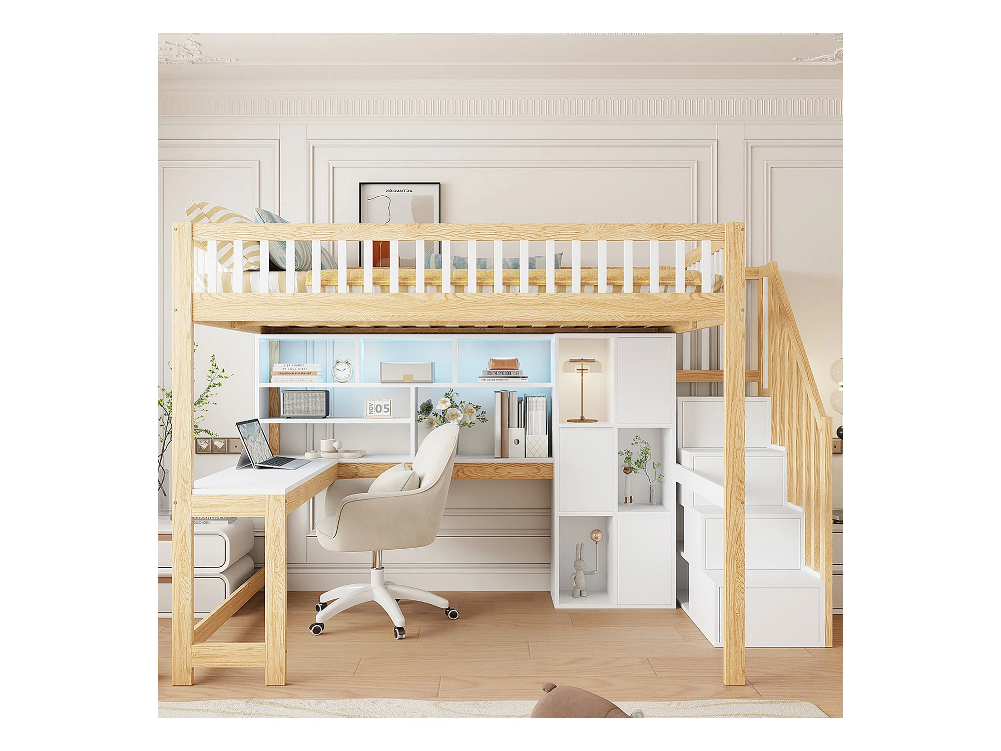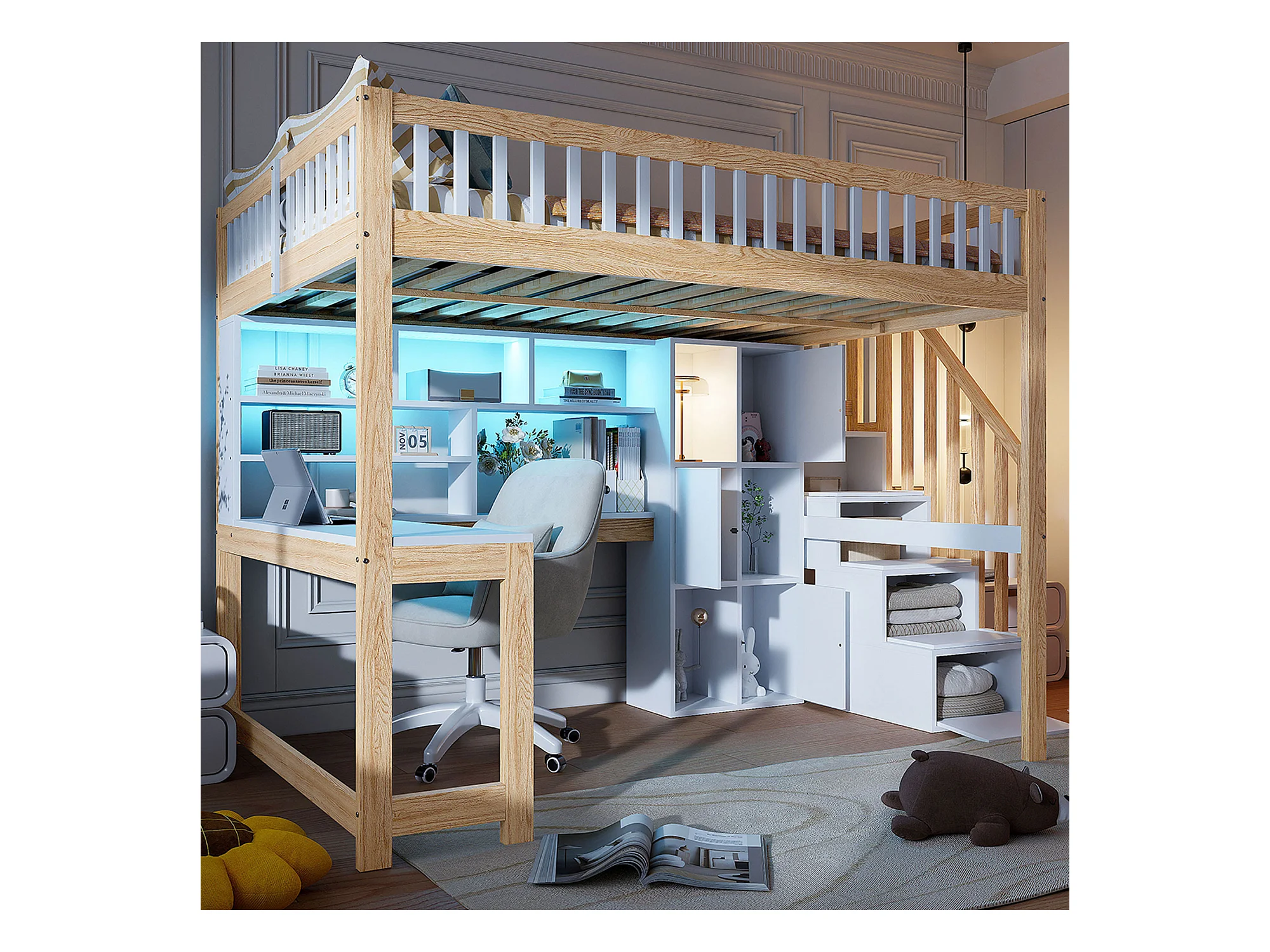 Hoogslaper 140x200 cm, met LED, opbergladder, planken, lades, bureau, MDF en grenen, wit en naturel (251x145x161 cm)