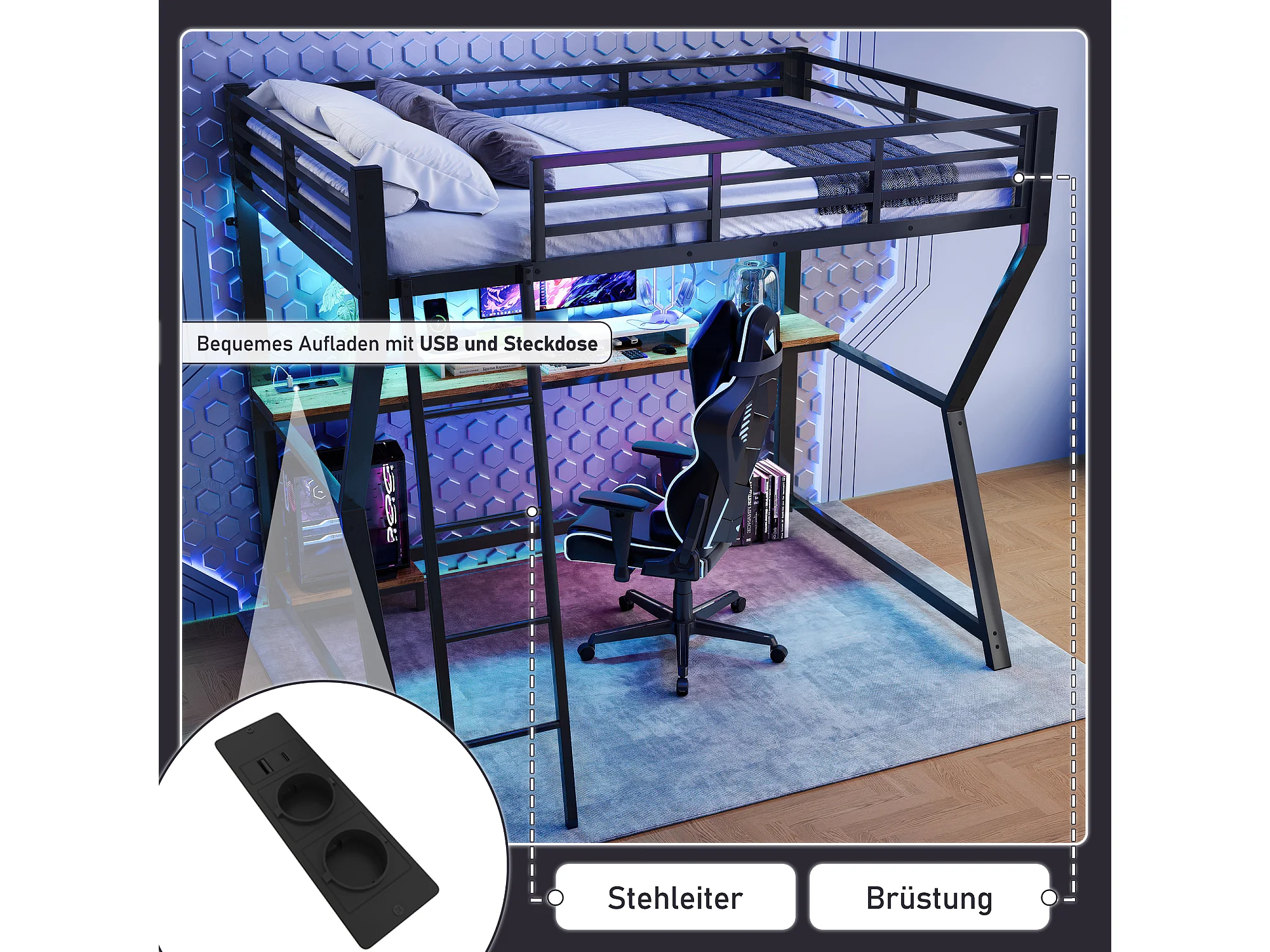 Hoogslaper 90 x 200 cm met bureau, stopcontact + USB-poort en planken - Sfeerverlichting - Metaal - Zwart (matras niet inbegrepen)
