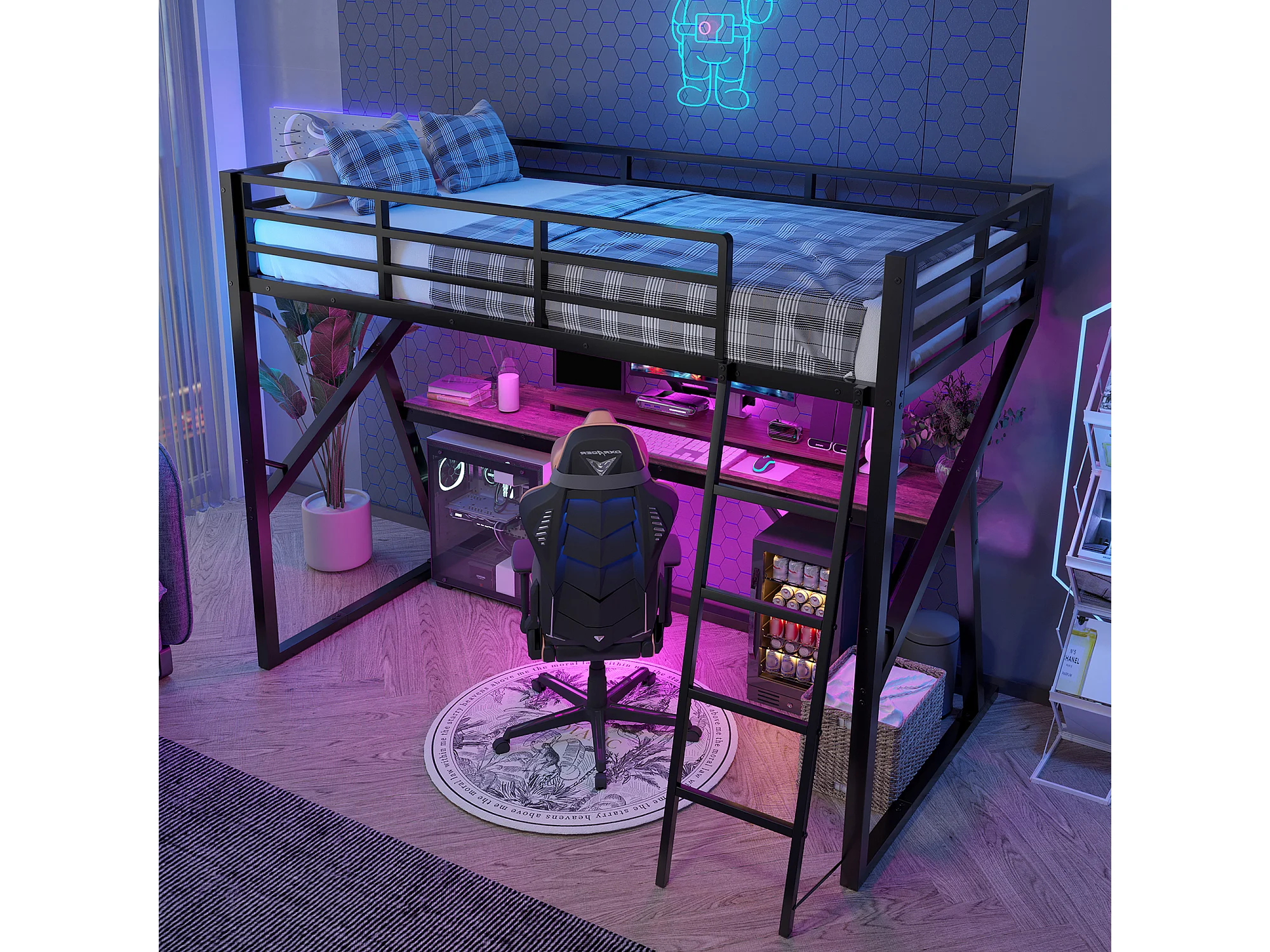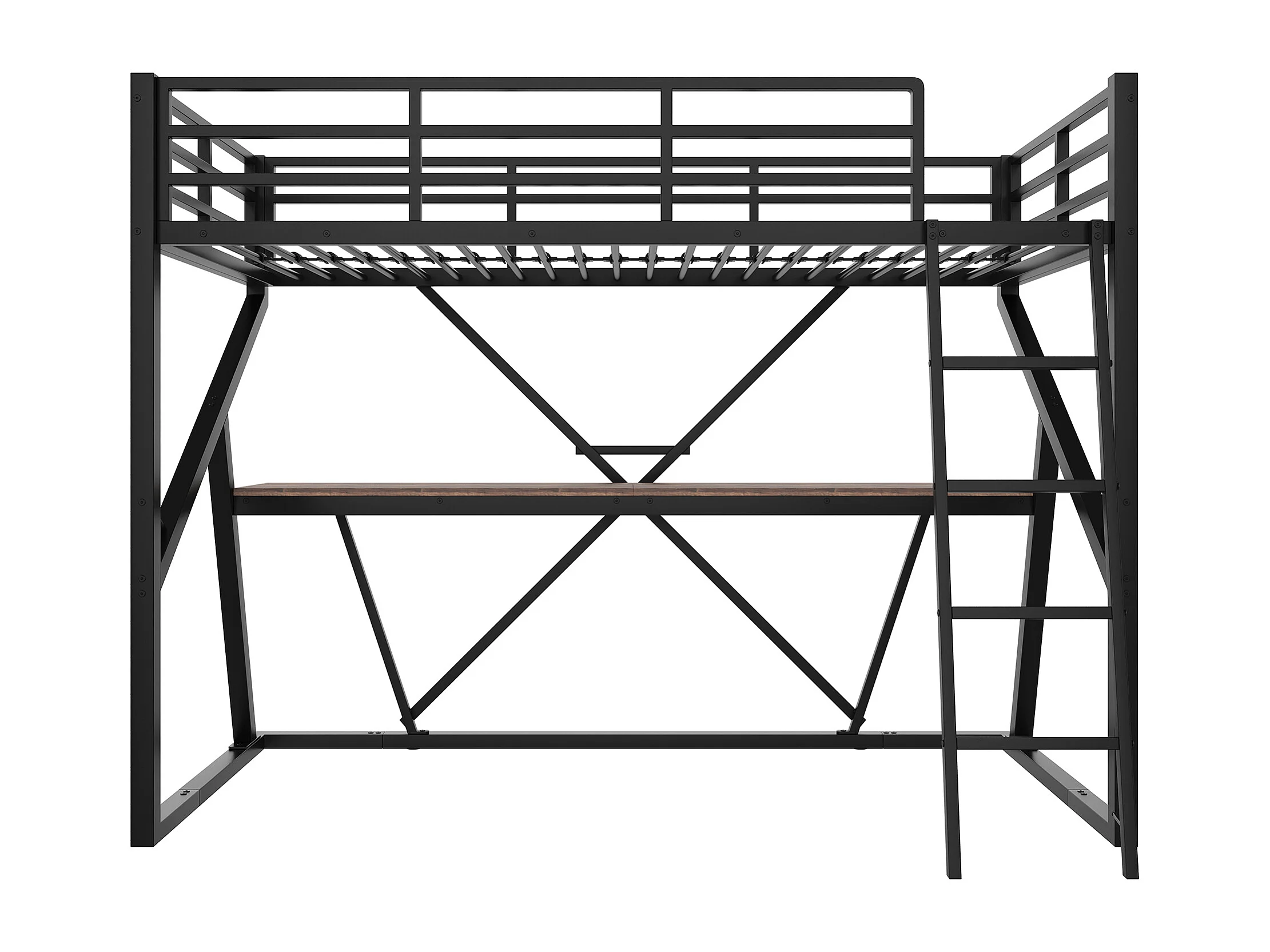 Hoogslaper 90x200 cm Kinderbed met ledverlichting en bureau, metalen frame - zwart (zonder matras)