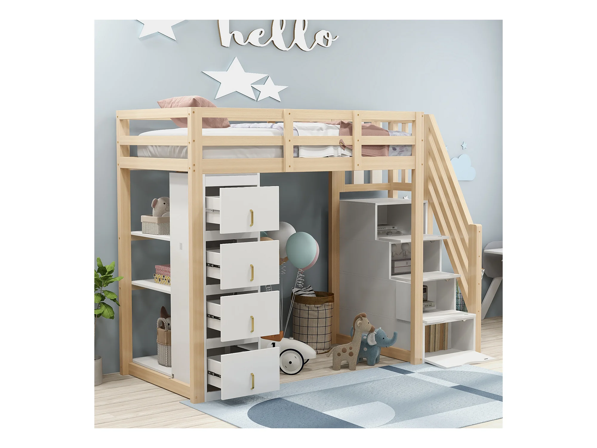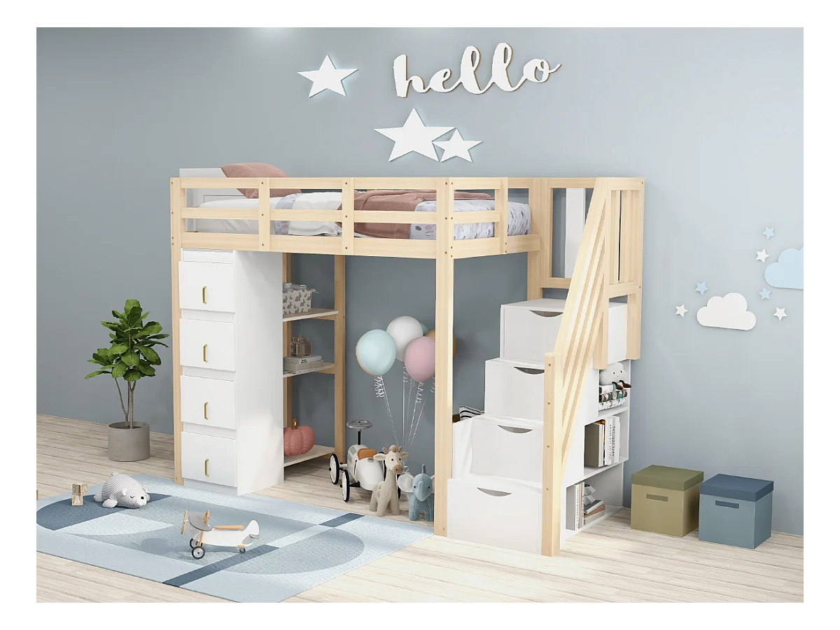 Hoogslaper 90 x 200 cm met bureau, planken en opbergruimte, veiligheidsladder met lades, frame van natuurlijk hout (205 x 126 x 180 cm)