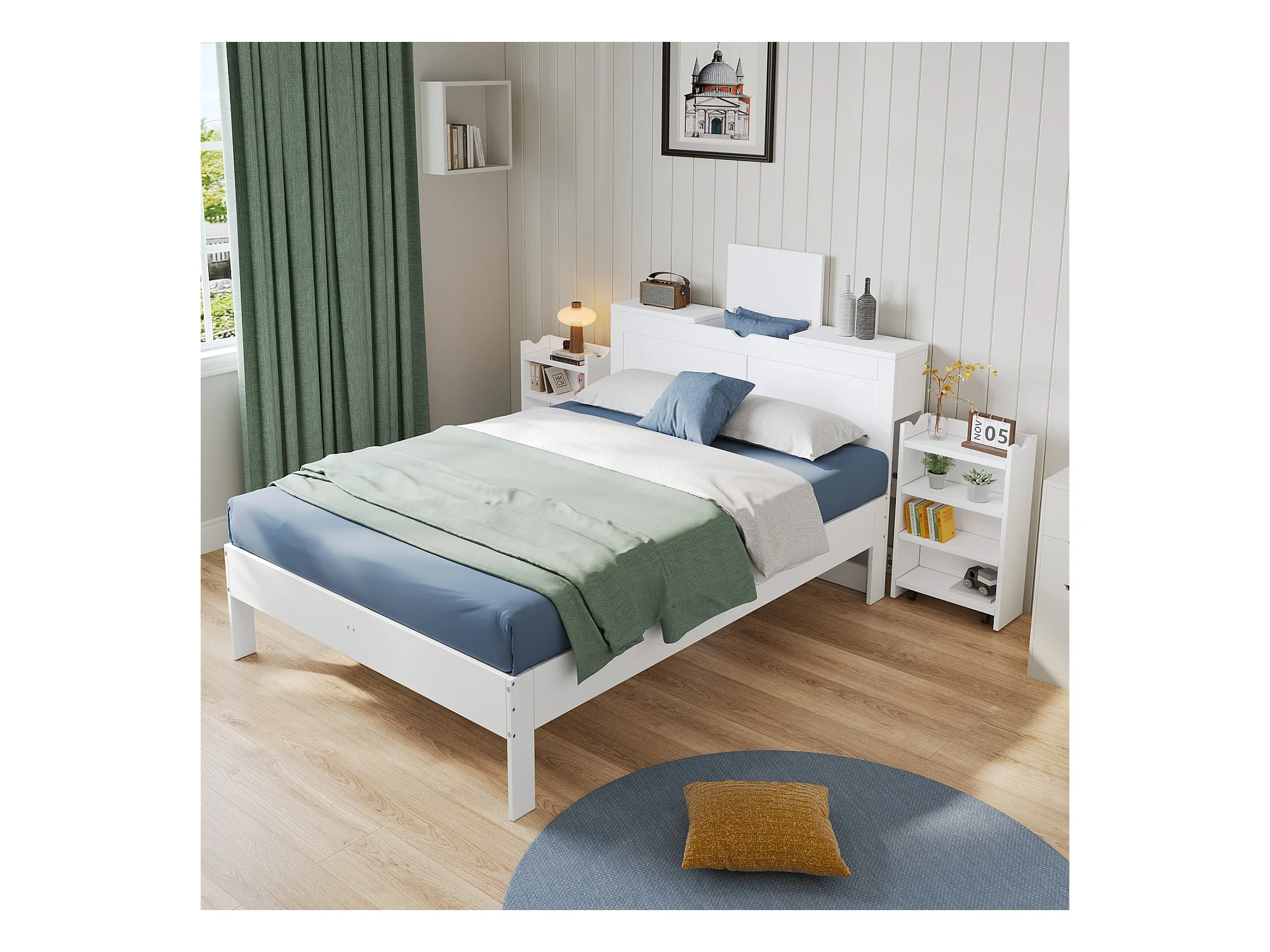 Bed 140x200 cm, met lattenbodem en hoofdbord, 2 uitschuifbare nachtkastjes, telefoonoplaadfunctie, MDF, Wit (140x200x100,5 cm)