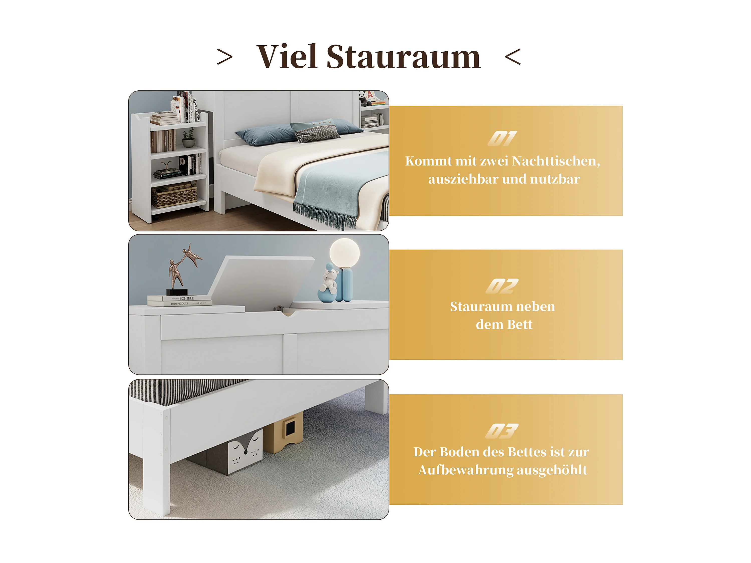 Houten bed 140x200 cm met hoofdeinde, geïntegreerde opbergruimte, 2 uitschuifbare nachtkastjes, MDF, wit (244,4x115x75 cm)
