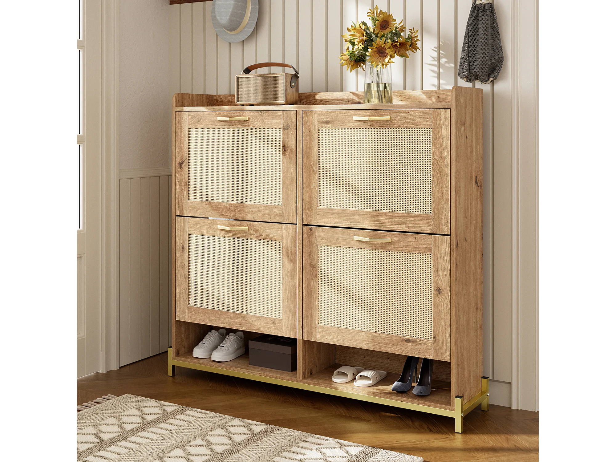 Houten schoenenkast met vier uitklapbare laden, rotandeuren, afmetingen: 108,5 x 24 x 100 cm