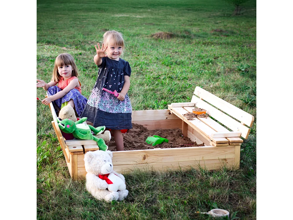 Zandbak van massief grenenhout met vierkante zitplaatsen voor kinderen
