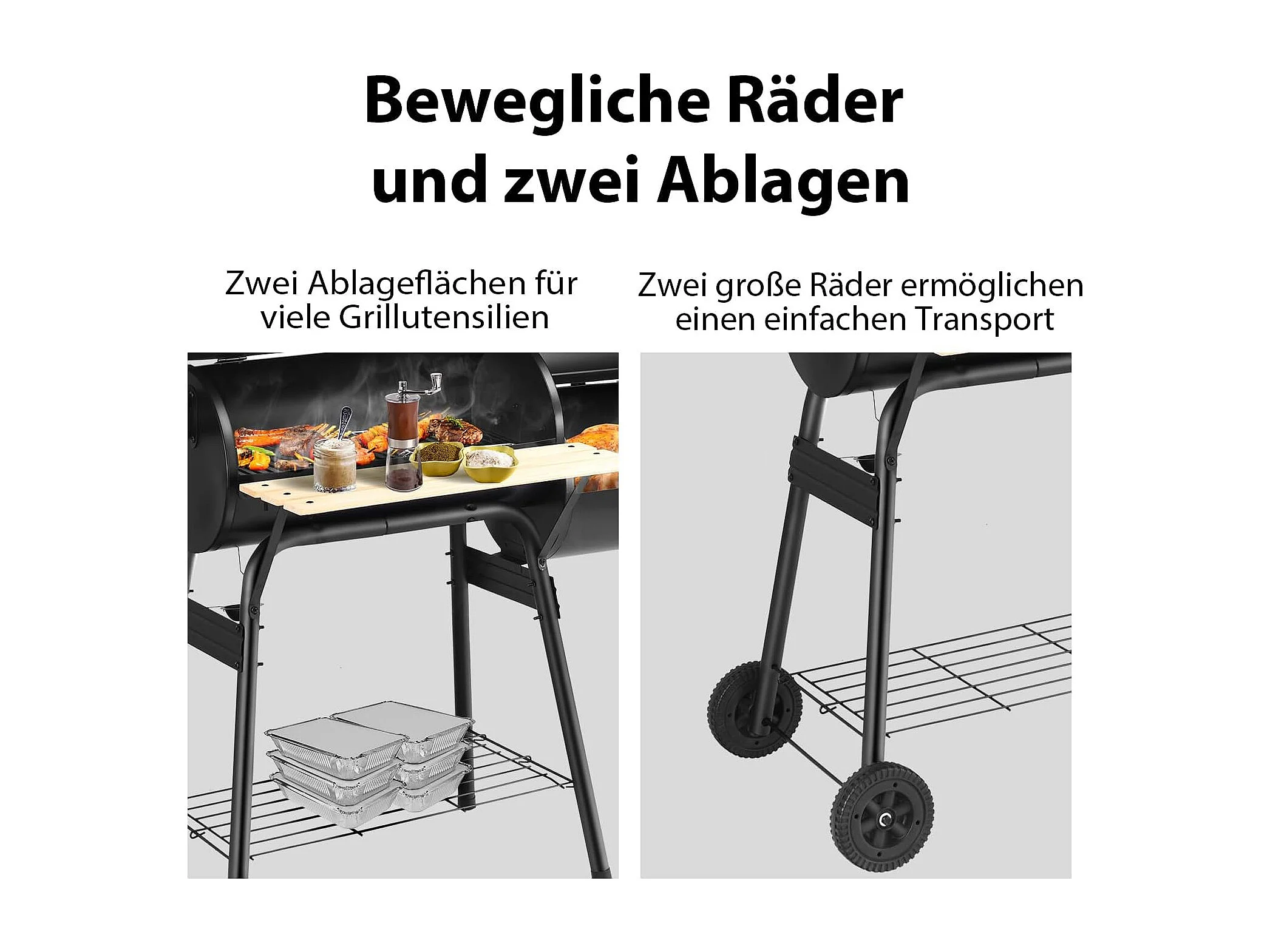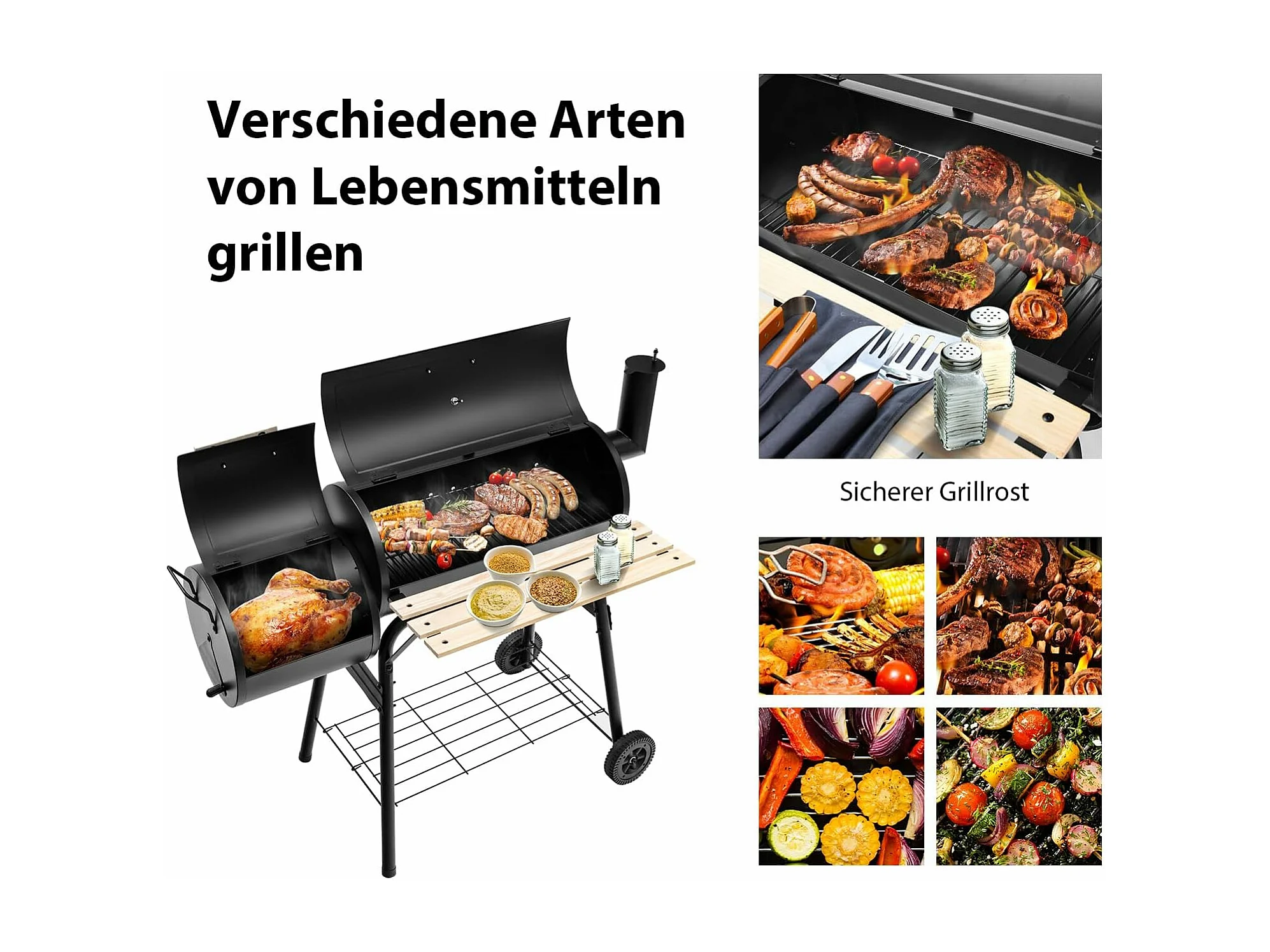 Houtskoolgrill met deksel, grillwagen met wielen, zijvuurbox, zijtafel, plank, houten handgrepen, thermometer, houtskoolgrill voor camping, terras, tuin