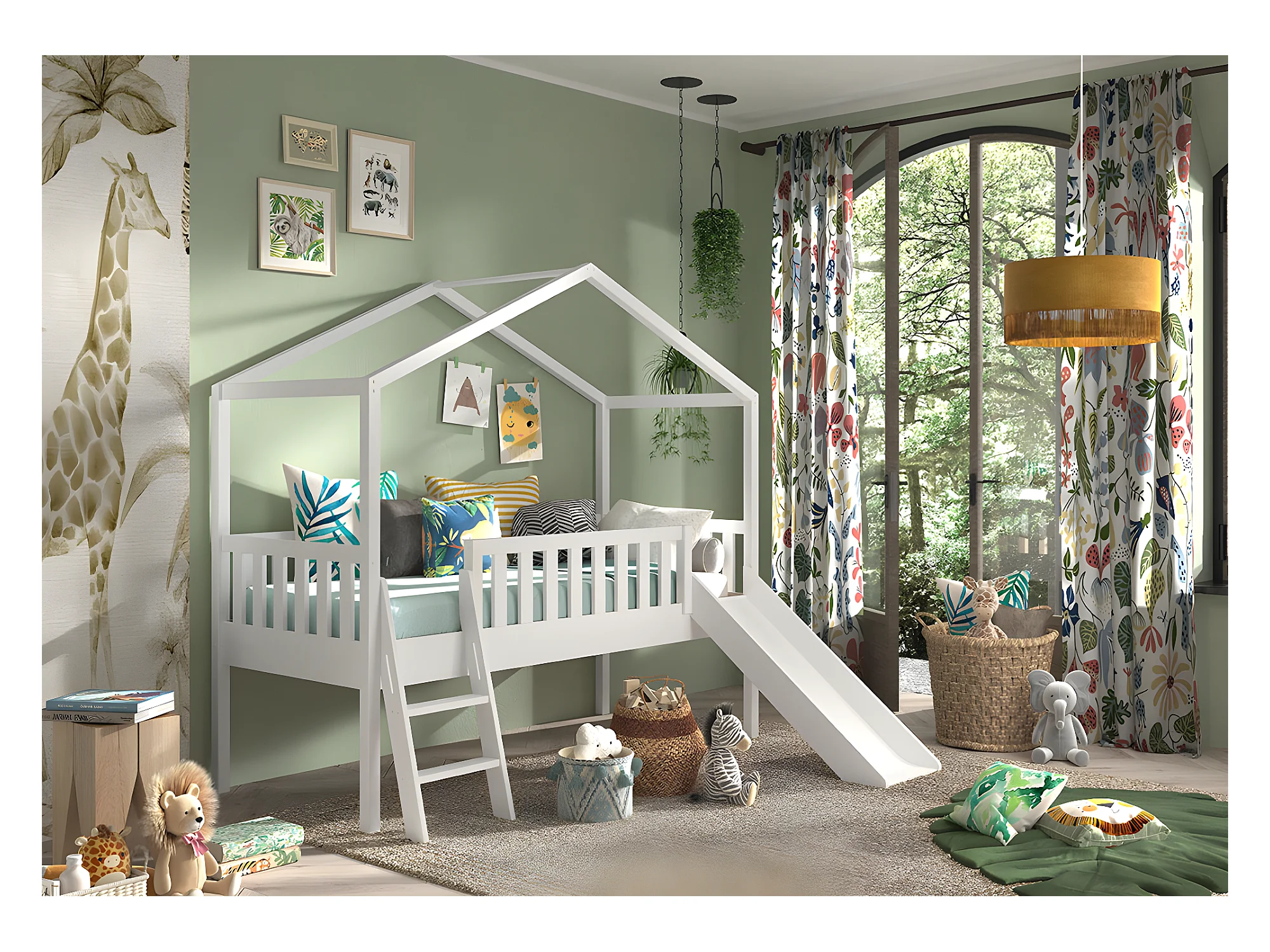 Kinderbed 90x200cm, vlak bed in huisvorm, massief grenen, eenvoudig design, wit