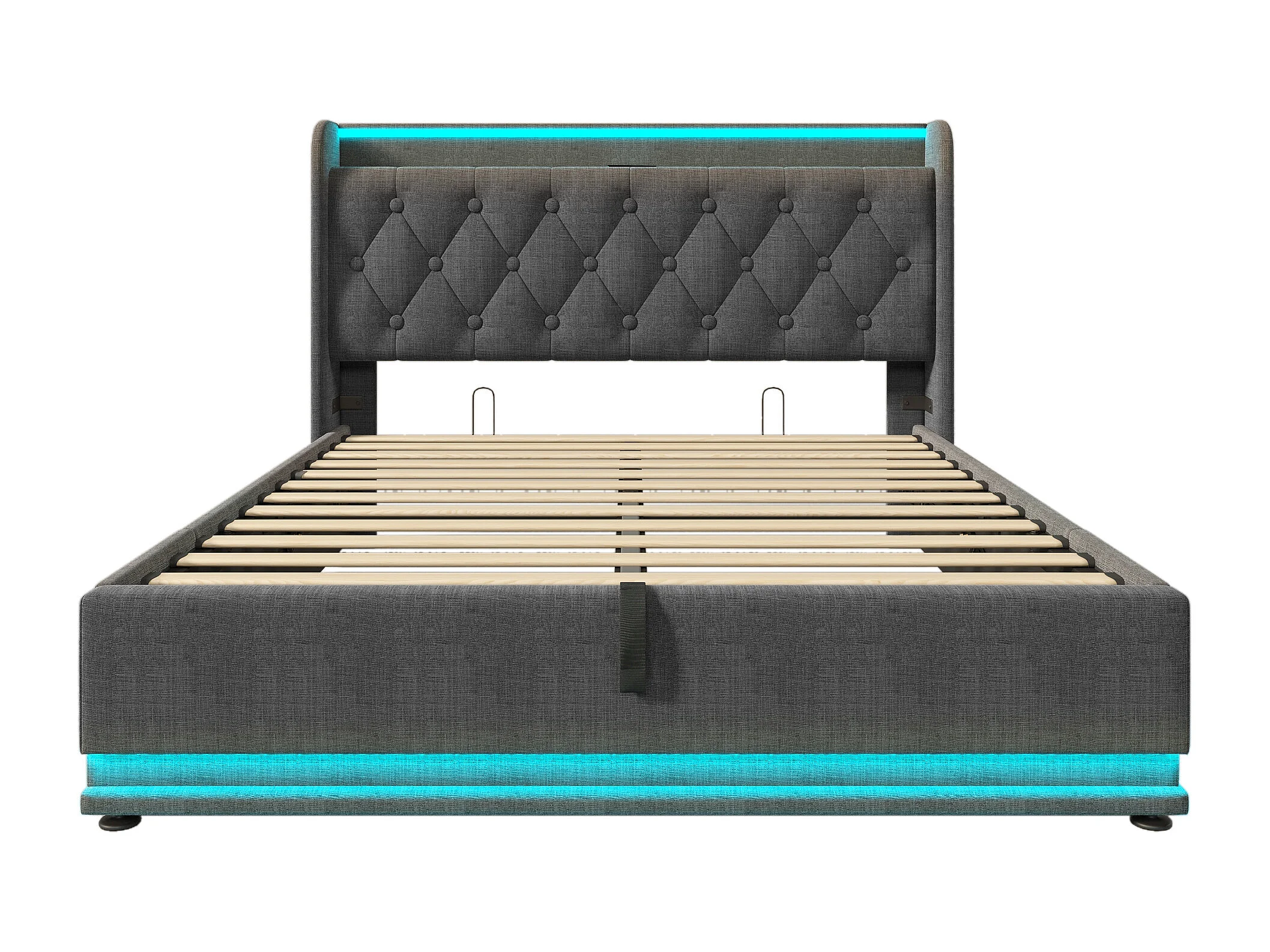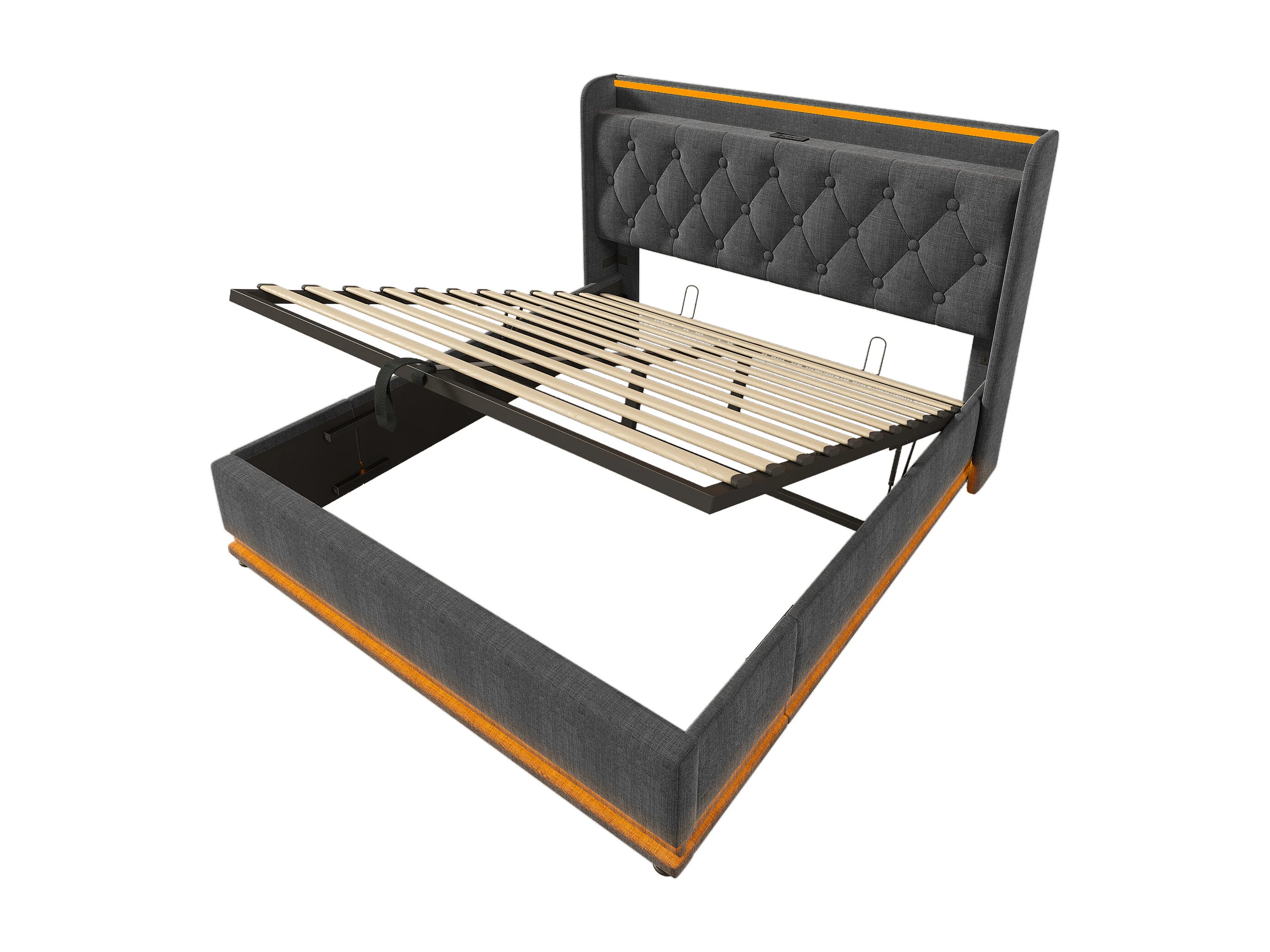 Hydraulisch gestoffeerd bed, 140 x 200 cm, tweepersoonsbed, opbergbed, hoofdbord met USB Type-C, grijs, inclusief matras