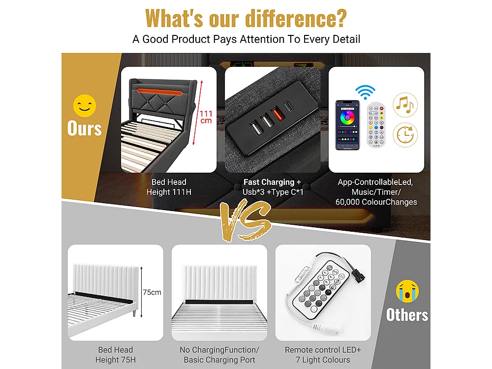 Volwassen bed 140x200 cm bed gestoffeerd bed led verlichting bed 4 laden bed houten lattenbodem tweepersoonsbed grijs linnen