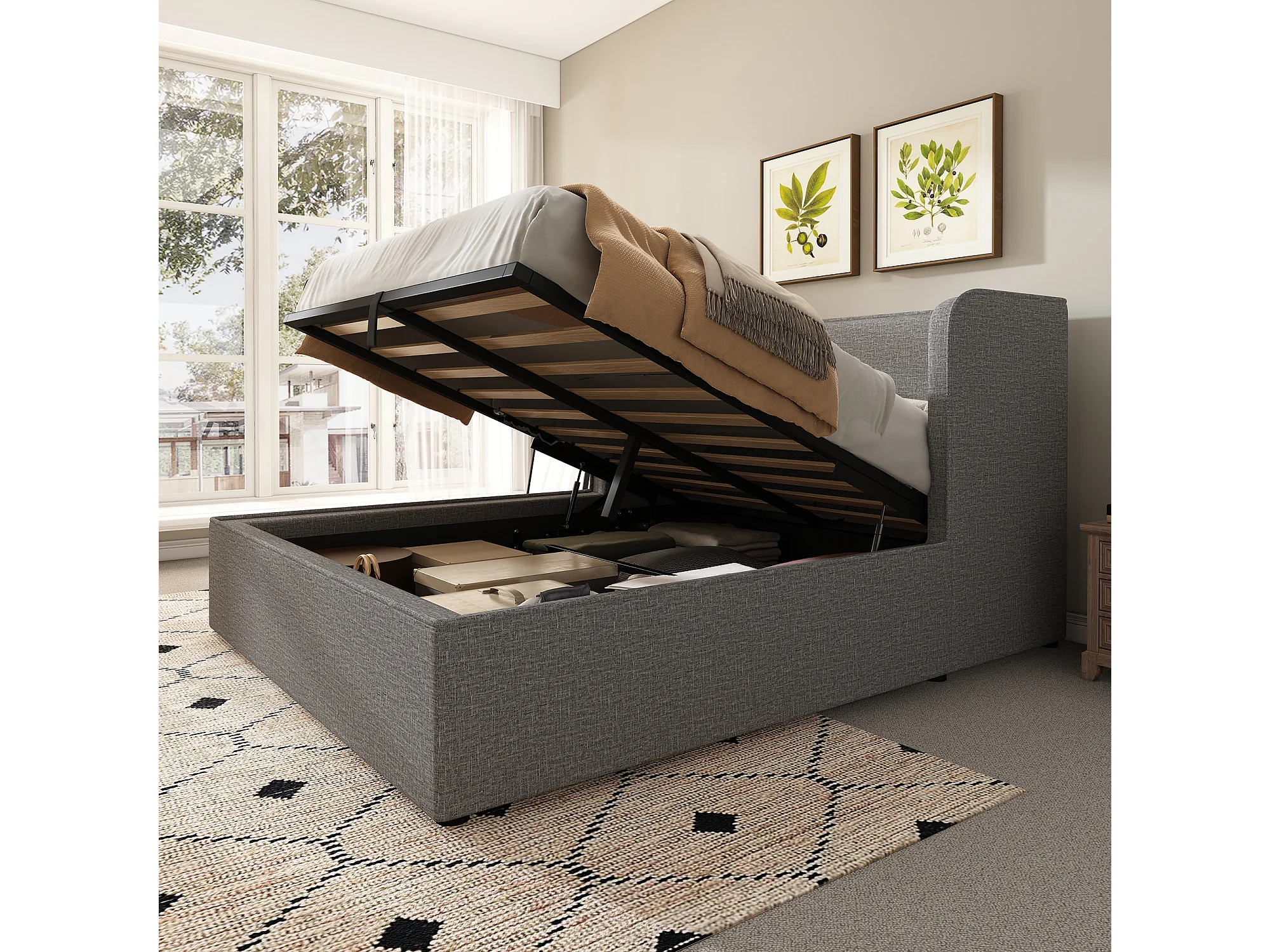 Hydraulisch gestoffeerd bed, 160 x 200 cm, tweepersoonsbed, opbergbed met lattenbodem en zijrails, linnen, grijs, inclusief matras