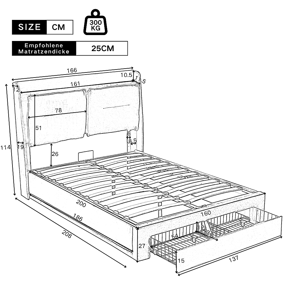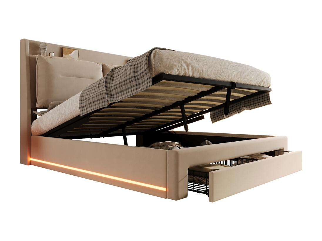 Hydraulisch gestoffeerd bed 160x200cm, opberglades, met lattenbodem, zonder matras, fluweel, beige