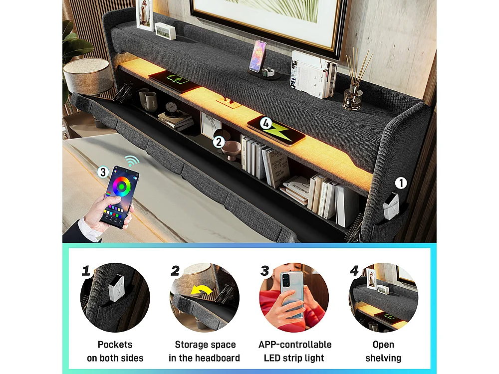 160x200 cm opbergbed gestoffeerd bed led-verlichting bed met usb type c oplaadfunctie tweepersoonsbed grijs linnen