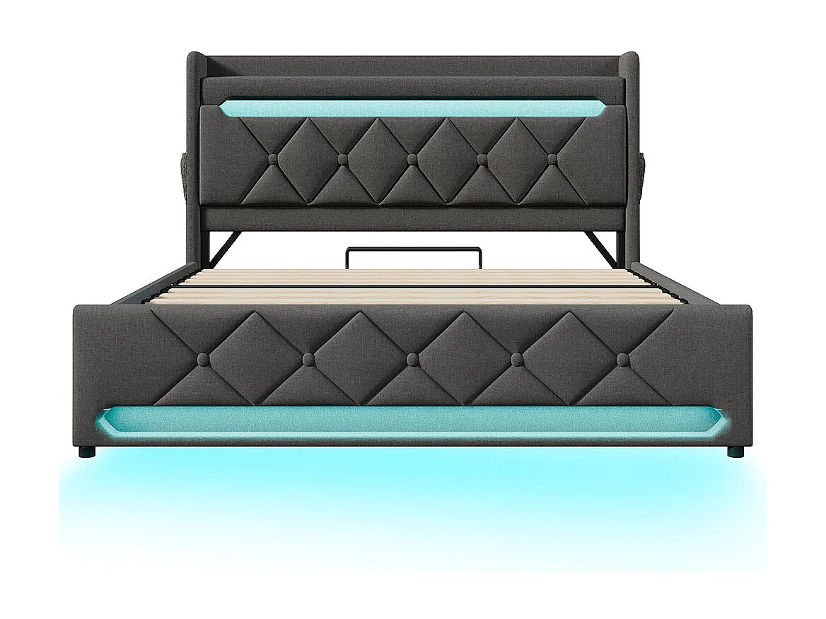 Volwassen bed 160x200 cm gestoffeerd bed opbergbed met sfeerverlichting tweepersoonsbed grijs linnen