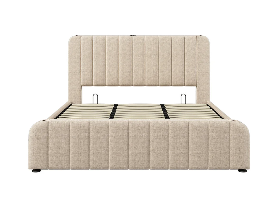 Hydraulisch gestoffeerd bed 180x200 cm, tweepersoonsbed, bed met opbergruimte, hoofdbord met USB Type-C oplaadfunctie, linnen, beige