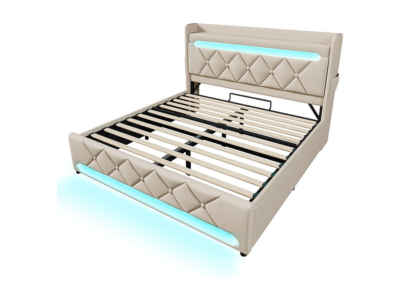 hydraulisch gestoffeerd bed 180x200 cm opbergbed usb bed metalen bed houten lattenbodem led tweepersoonsbed beige linnen