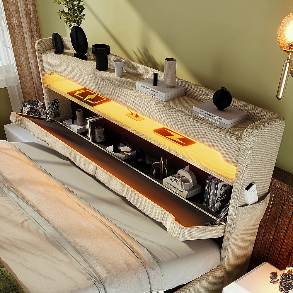 Tweepersoonsbed met hydraulische opbergruimte, multifunctioneel hoofdeinde, beige linnen, massief houten en metalen frame, met lamp en USB-poorten (232x213x104cm)