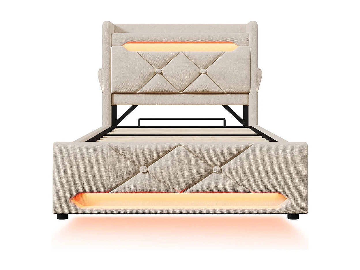 Eenpersoonsbed 90x200cm in linnenstof met LED en 2 laden - Beige