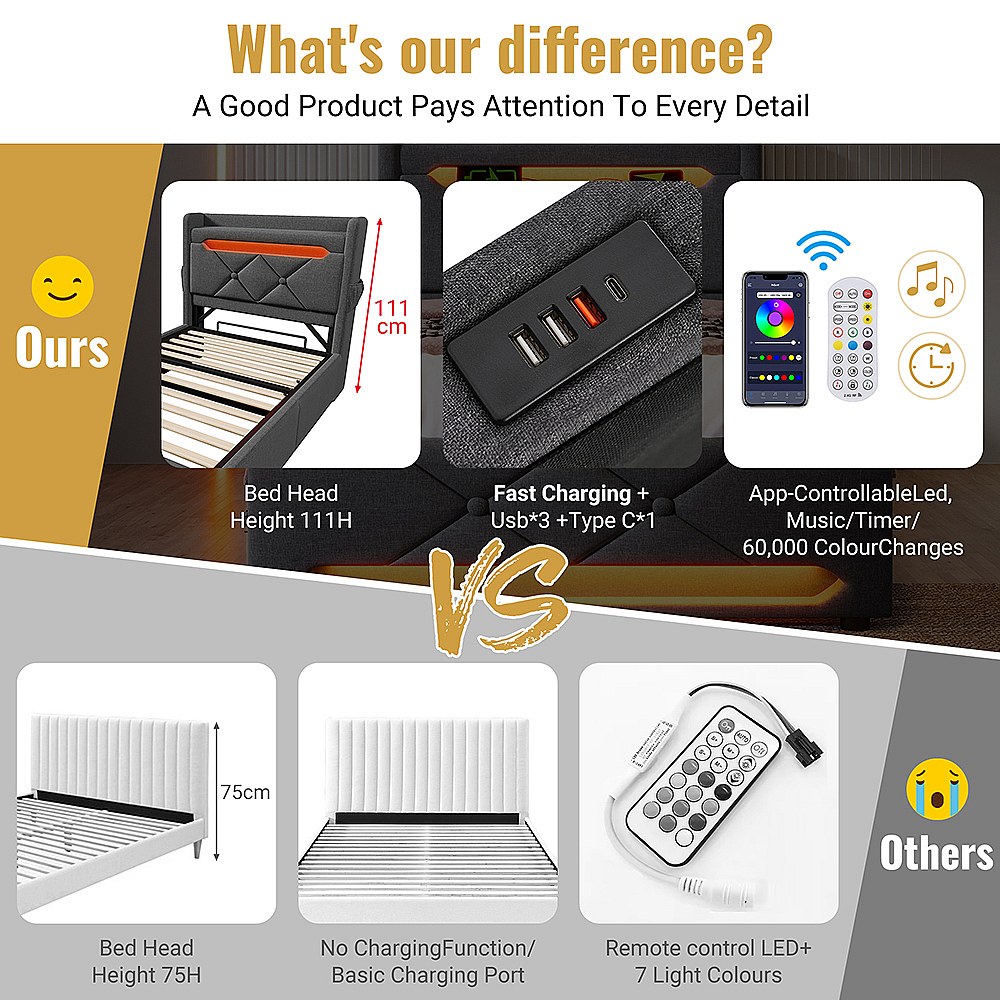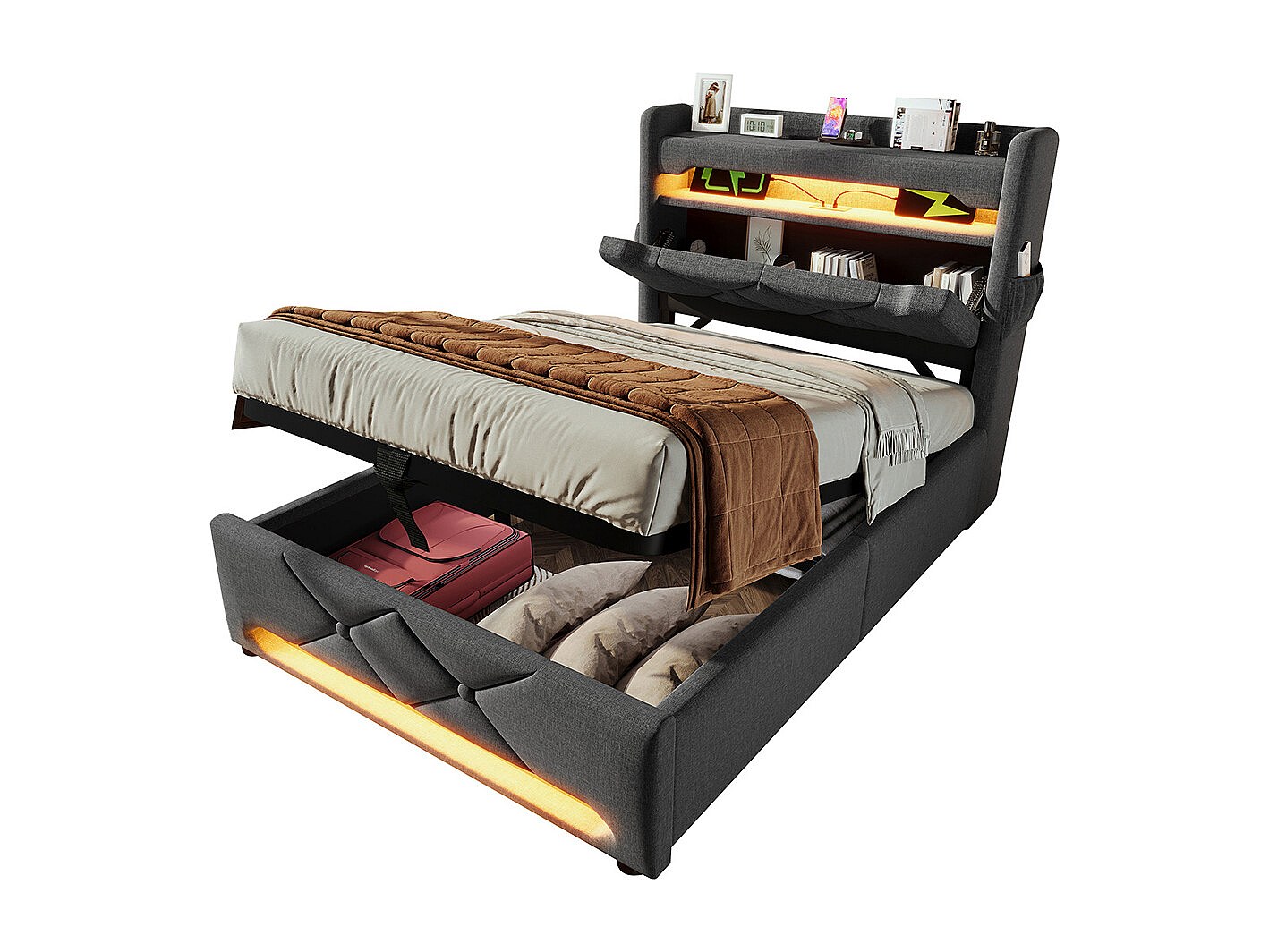 Gestoopt volwassen bed 90x200cm - met LED-verlichting - met 1 Type-C-poort en 3 USB-poorten - hoofdeinde met opbergruimte - linnen - Grijs