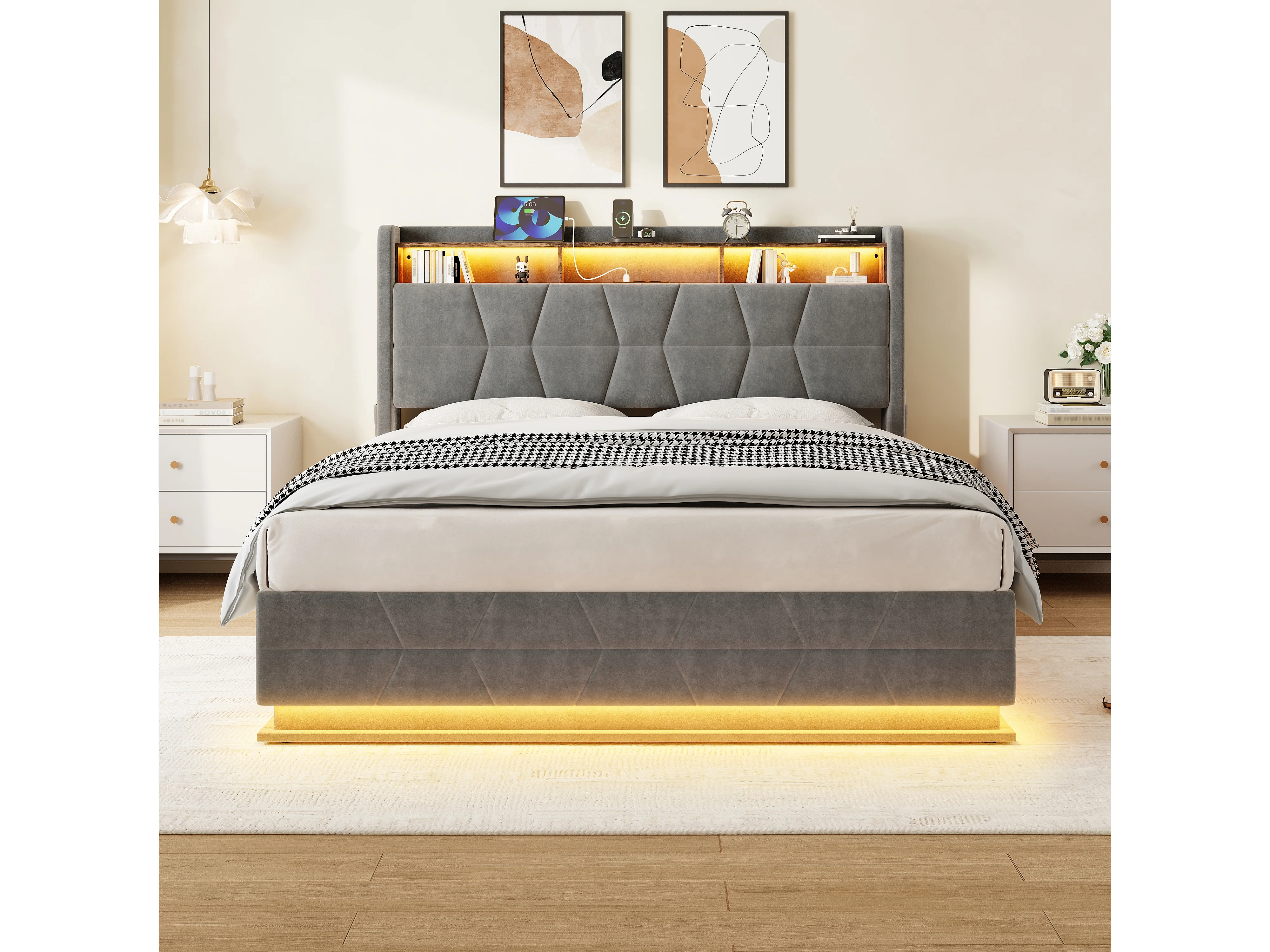 Hydraulisch opbergbed - 140 x 190 cm - met LED-verlichting + zijvakken + USB/Type-C + hoofdbord met opbergruimte - fluweel - donkergrijs