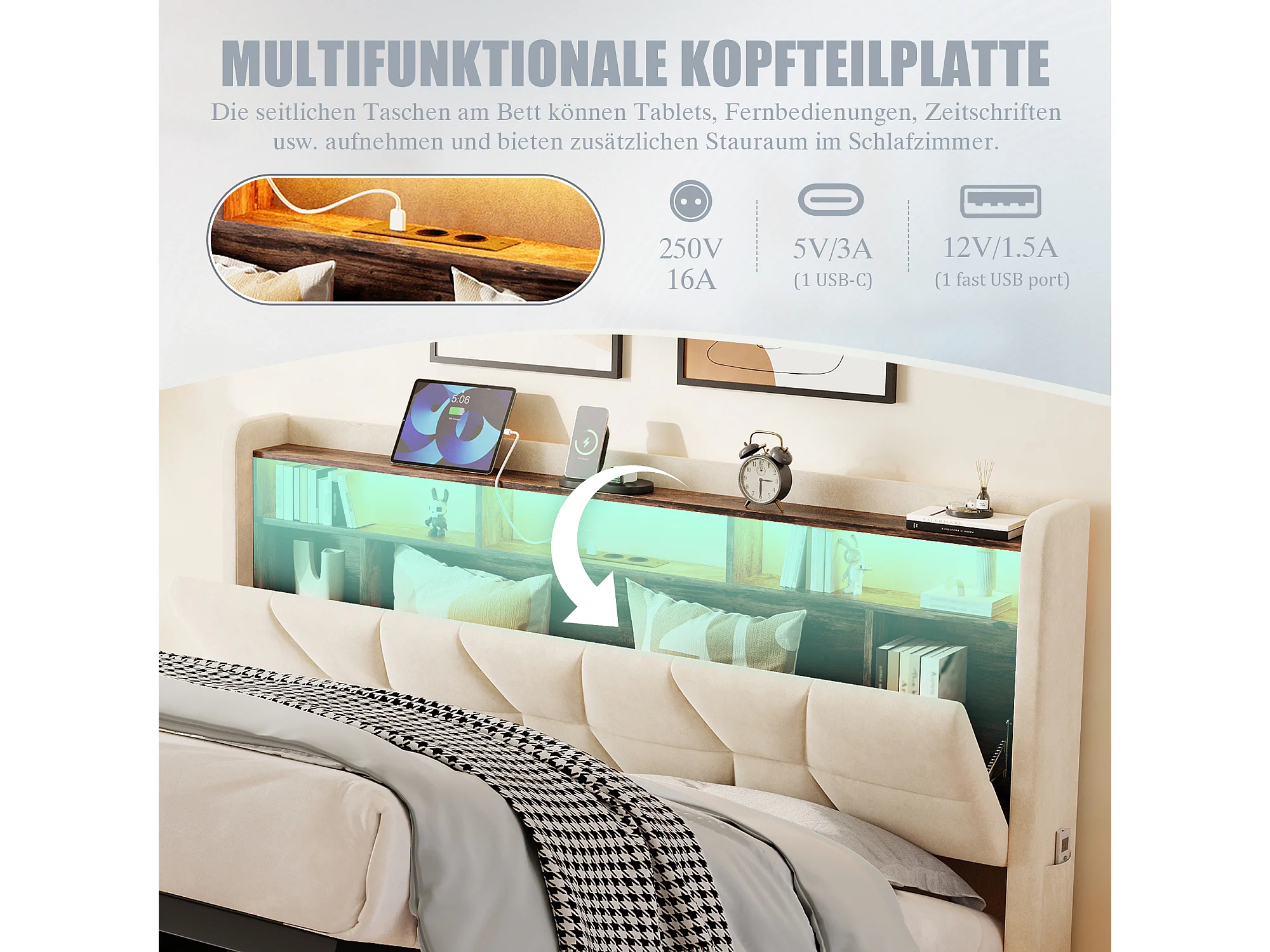 Hydraulisch opbergbed - 140 x 200 cm - met LED-verlichting + zijvakken + USB/Type-C + hoofdbord met opbergruimte - fluweel - beige