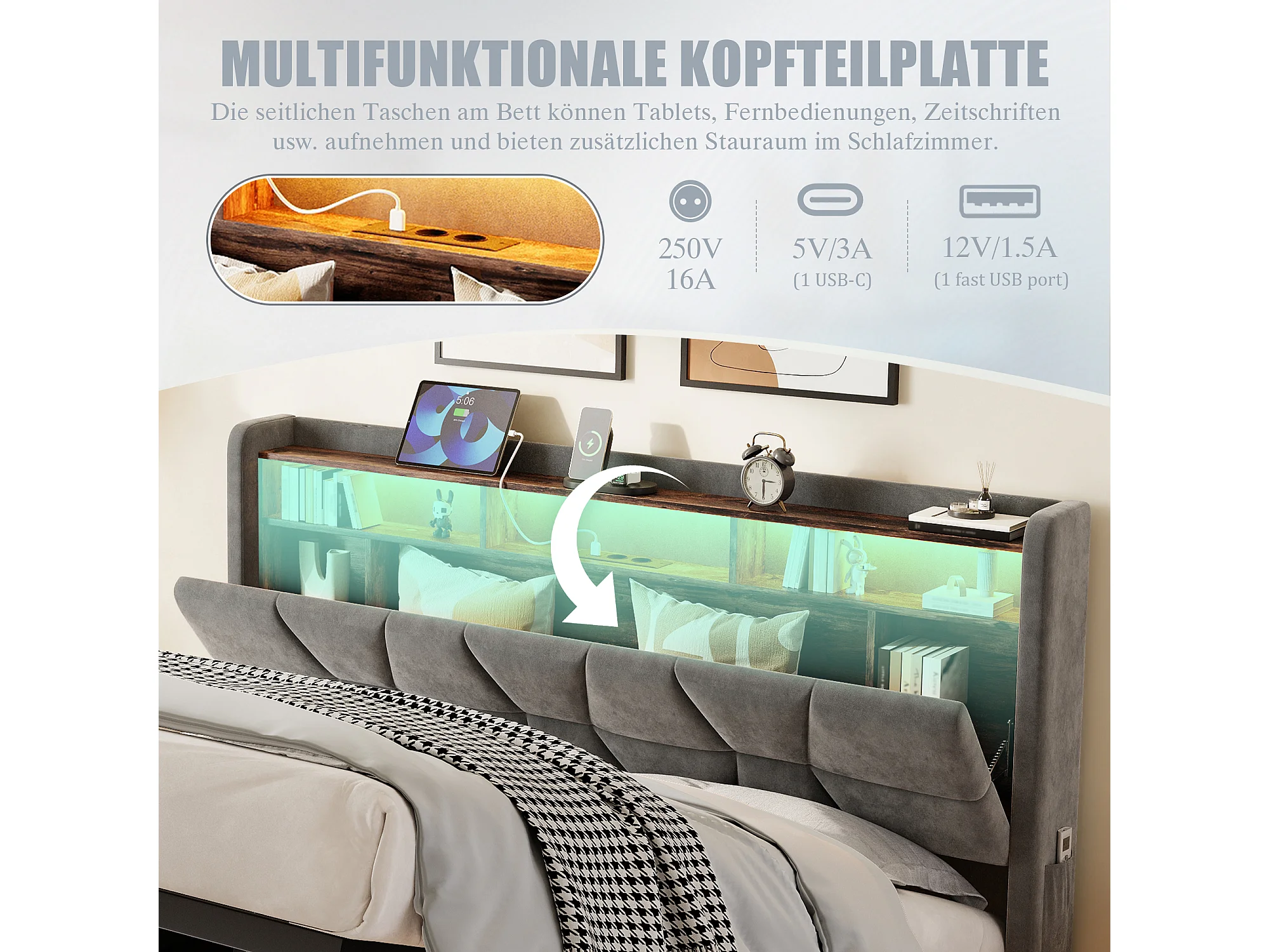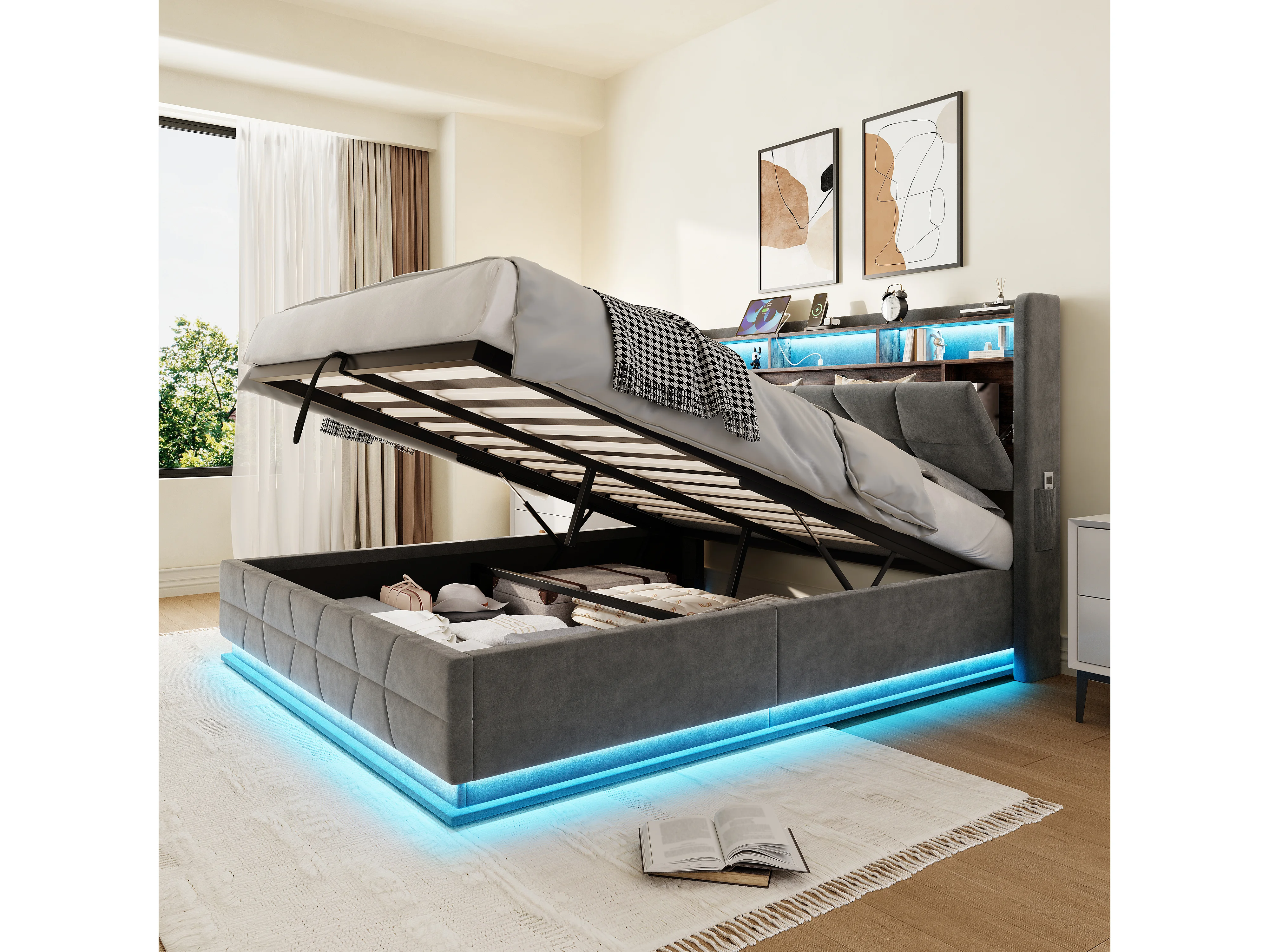 Hydraulisch opbergbed - 160 x 200 cm - met LED-verlichting + zijvakken + USB/Type-C + hoofdbord met opbergruimte - fluweel - donkergrijs