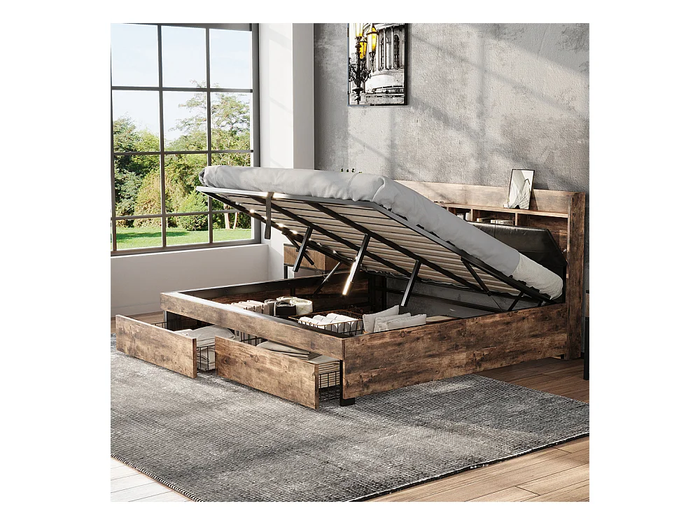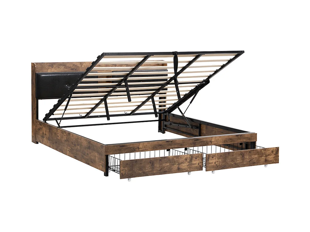 Tweepersoonsbed met opbergruimte aan het hoofdeinde en 4 laden - 180 x 200 cm - LED's en USB-aansluiting - MDF hout en metaal - industriële stijl - bruin