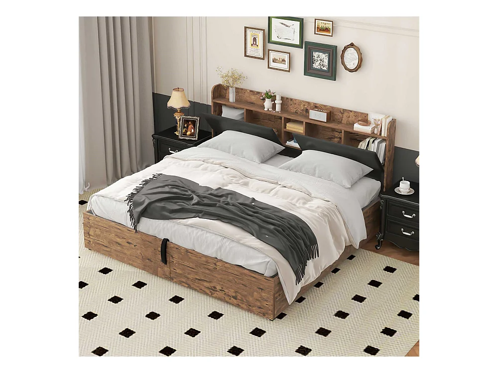 Hydraulisch tweepersoonsbed 180x200cm, bed voor tieners, met opberghoofdeinde en lattenbodem, metaal, houtkleur + zwart