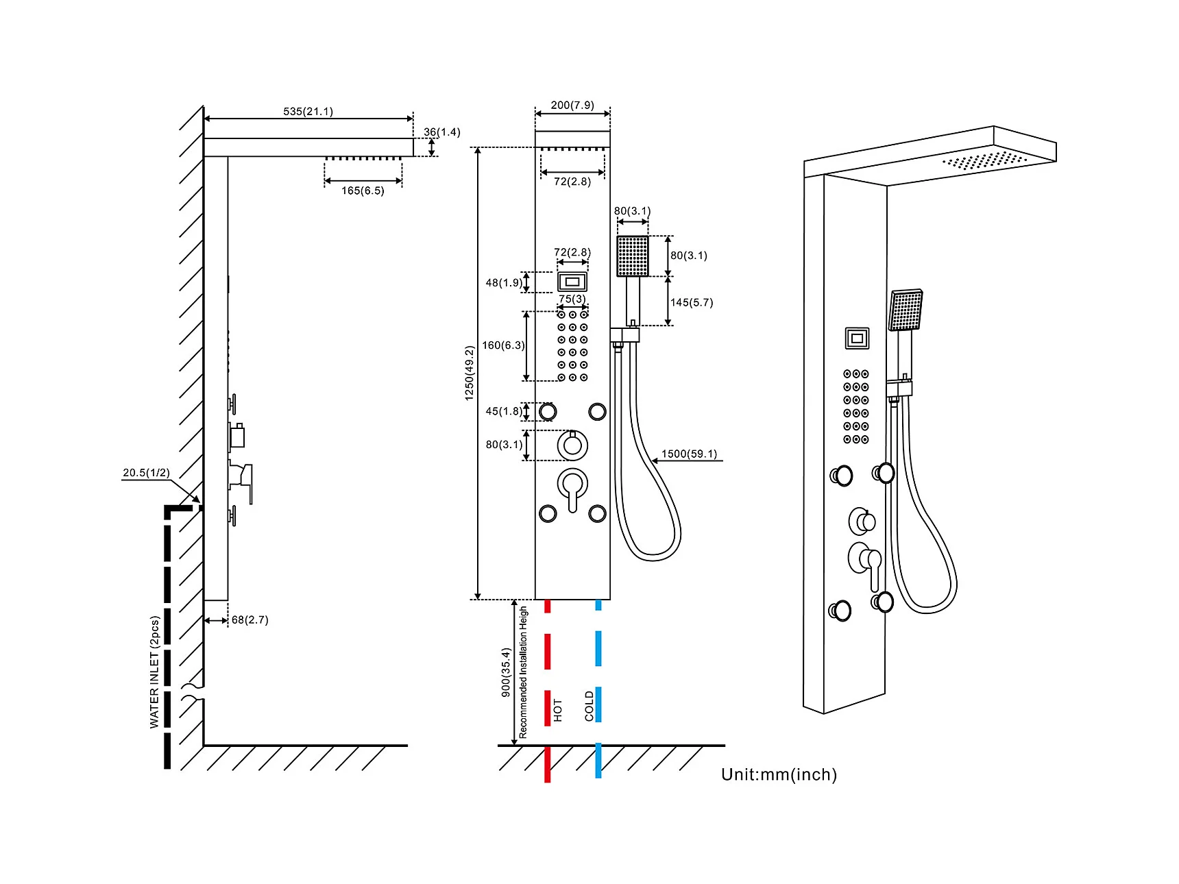 Hydromassage Douchekolompaneel met Temperatuurweergave Douchepaneel met 4 massagestralen, DoHoofddouche,Handdouche,EU Model