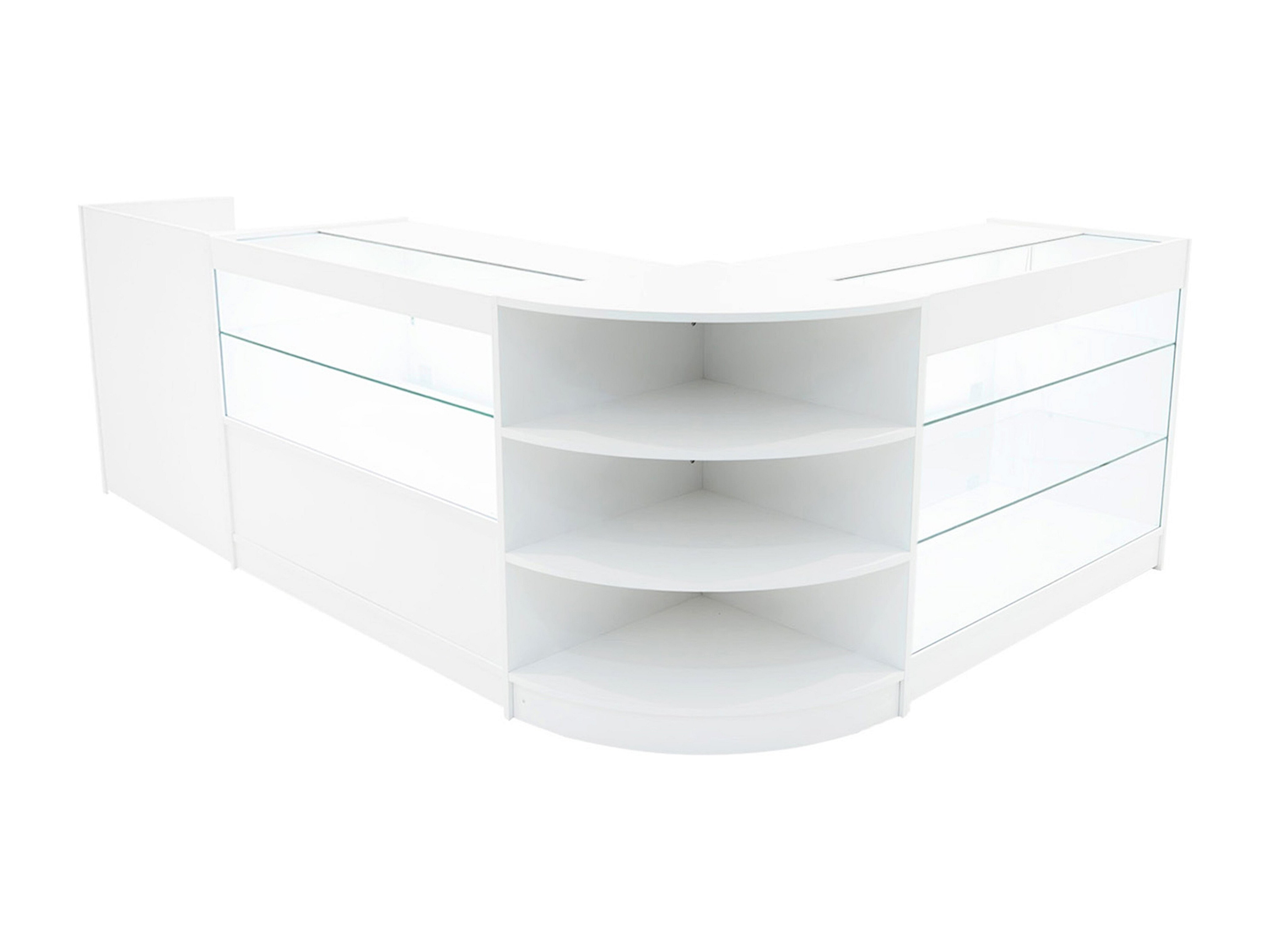 De LM60 gebogen hoekbalie voegt ruimtebesparende functionaliteit en een vloeiende indeling toe aan uw winkelruimte. Het compacte, gebogen ontwerp integreert netjes in hoeken of sluit naadloos aan op rechte balies, wat zorgt voor een samenhangend baliesysteem. De LM60 heeft drie open schappen aan de klantzijde die zorgen voor maximale zichtbaarheid en toegankelijkheid – ideaal voor het benutten van hoeken zonder de winkelindeling te verstoren.