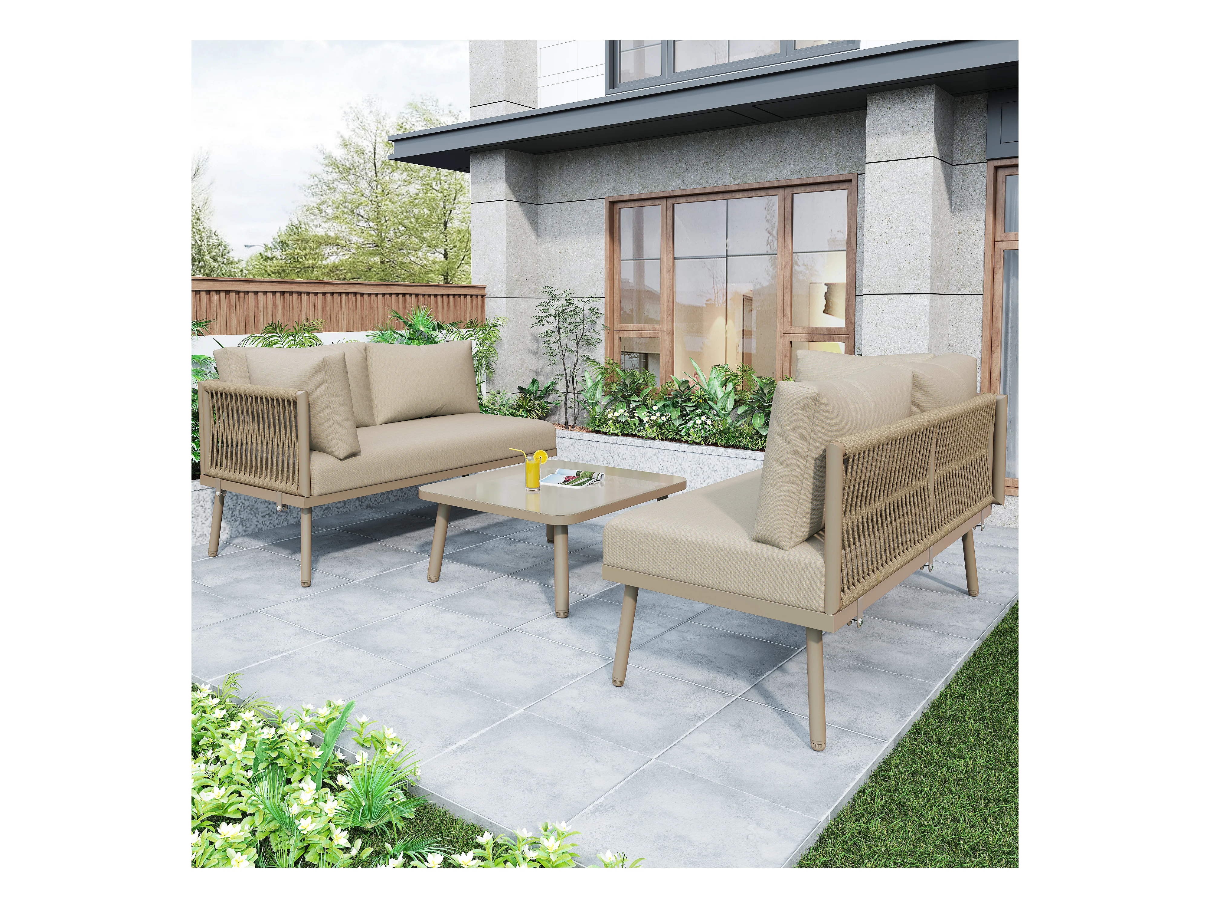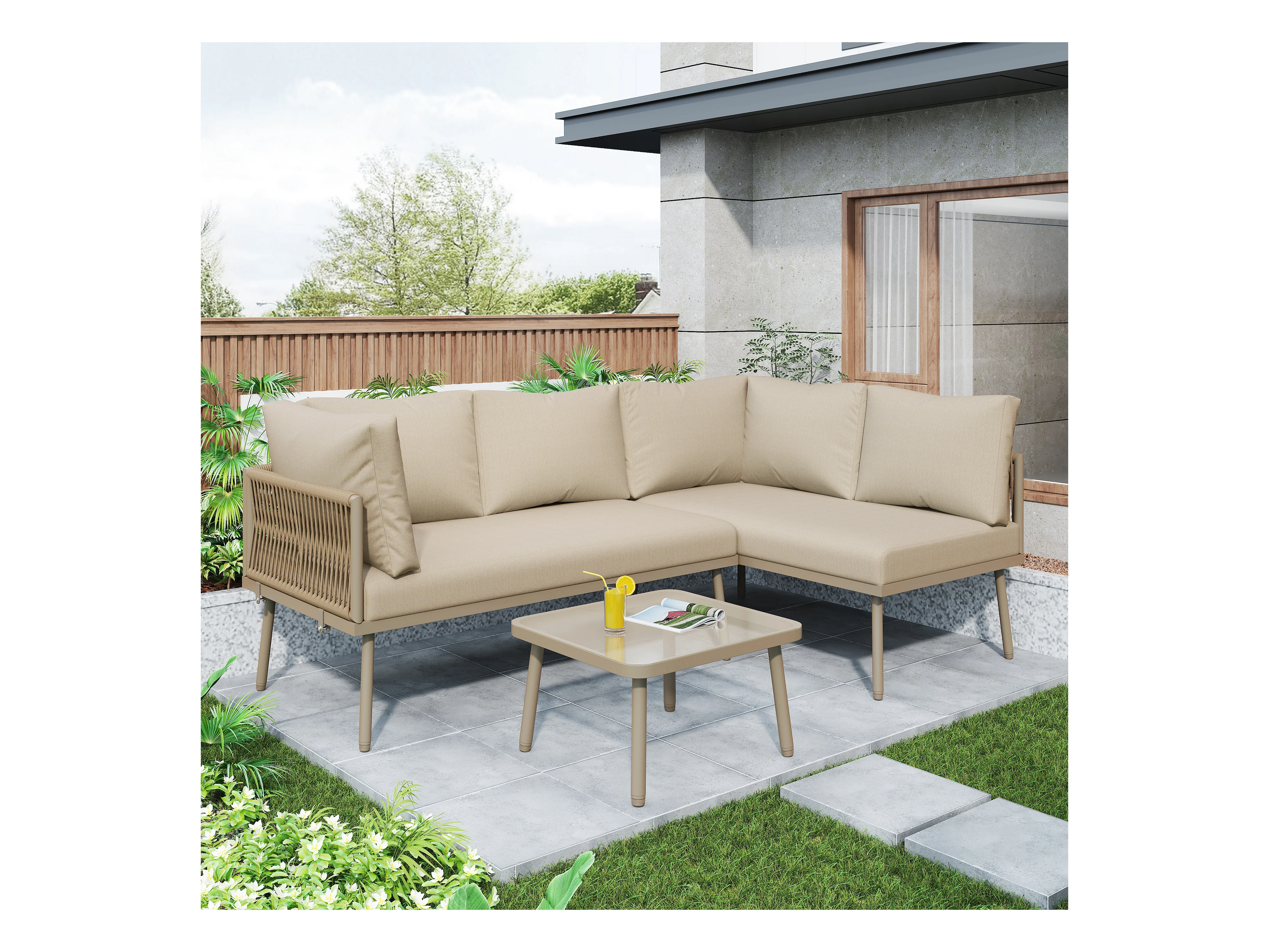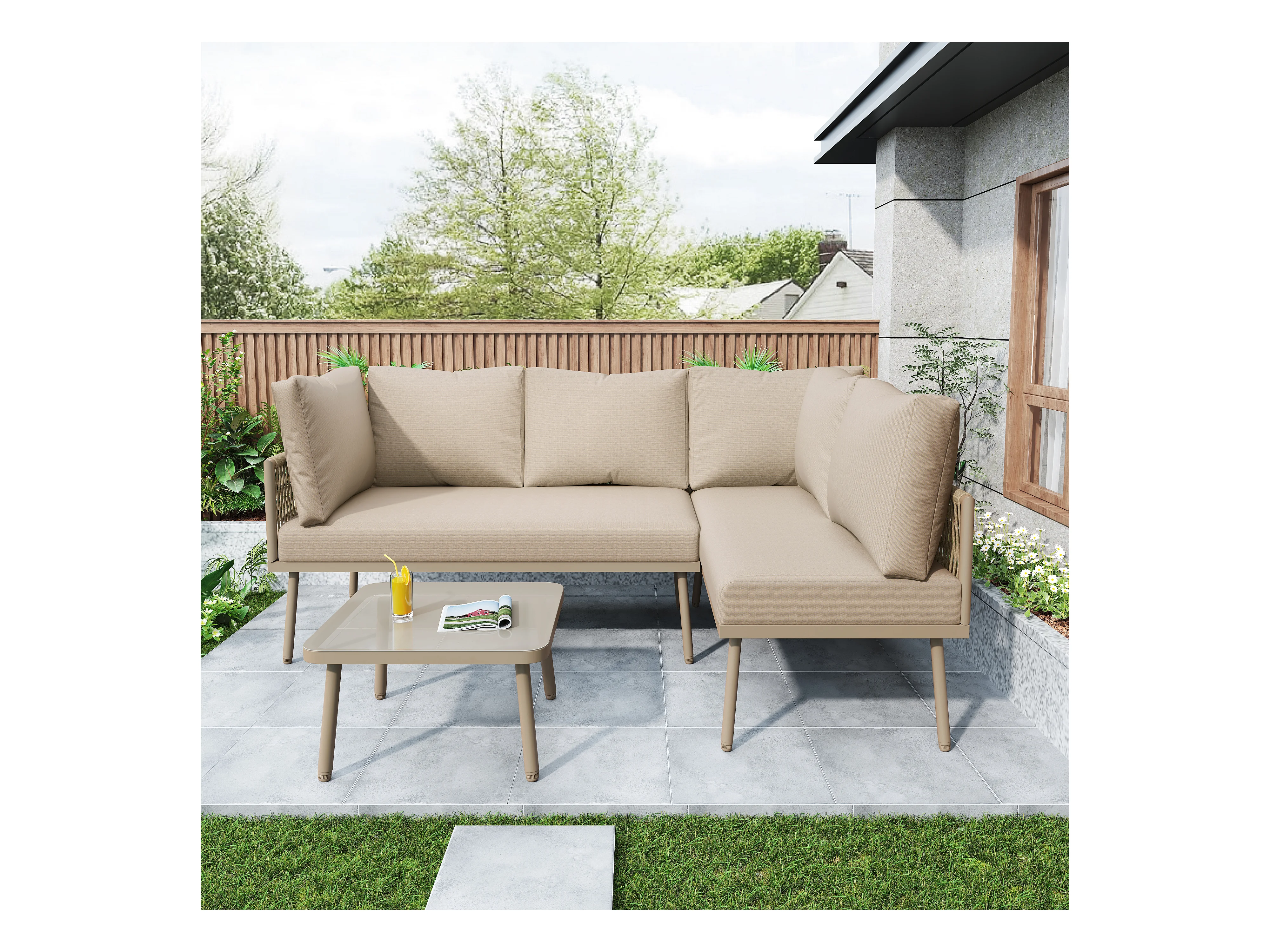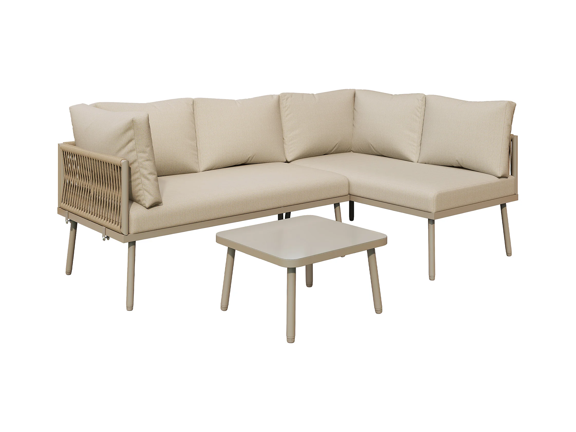 IJzeren tuinmeubelset, L-vormige tuinset met zitkussens, 2 banken en 1 tafel, kleur kaki