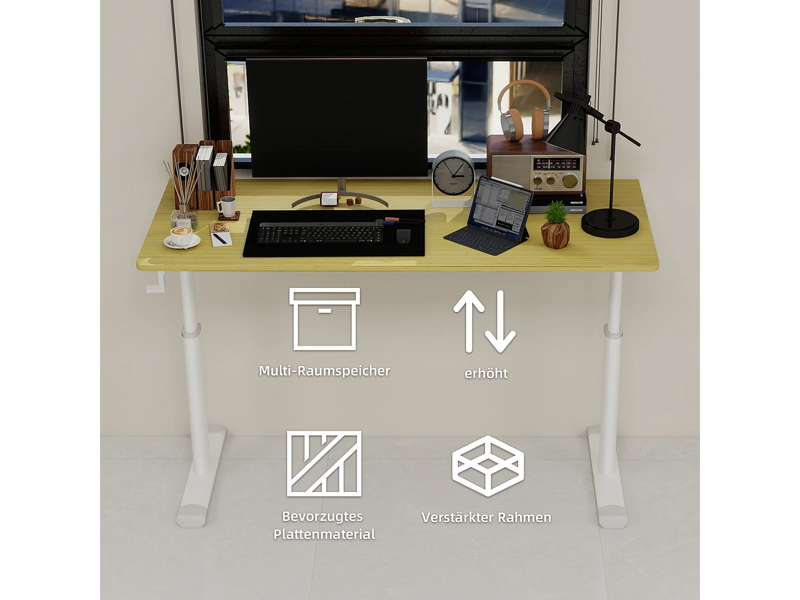 In hoogte verstelbaar bureau, wit met houttinten, 120x60 cm - Hout en metaal