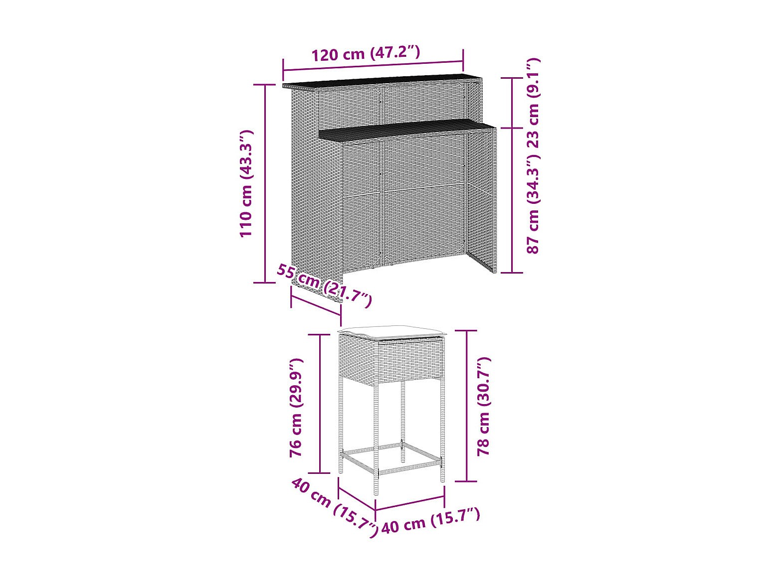 Inarin 3-delige Tuinbarset met kussens poly rattan grijs