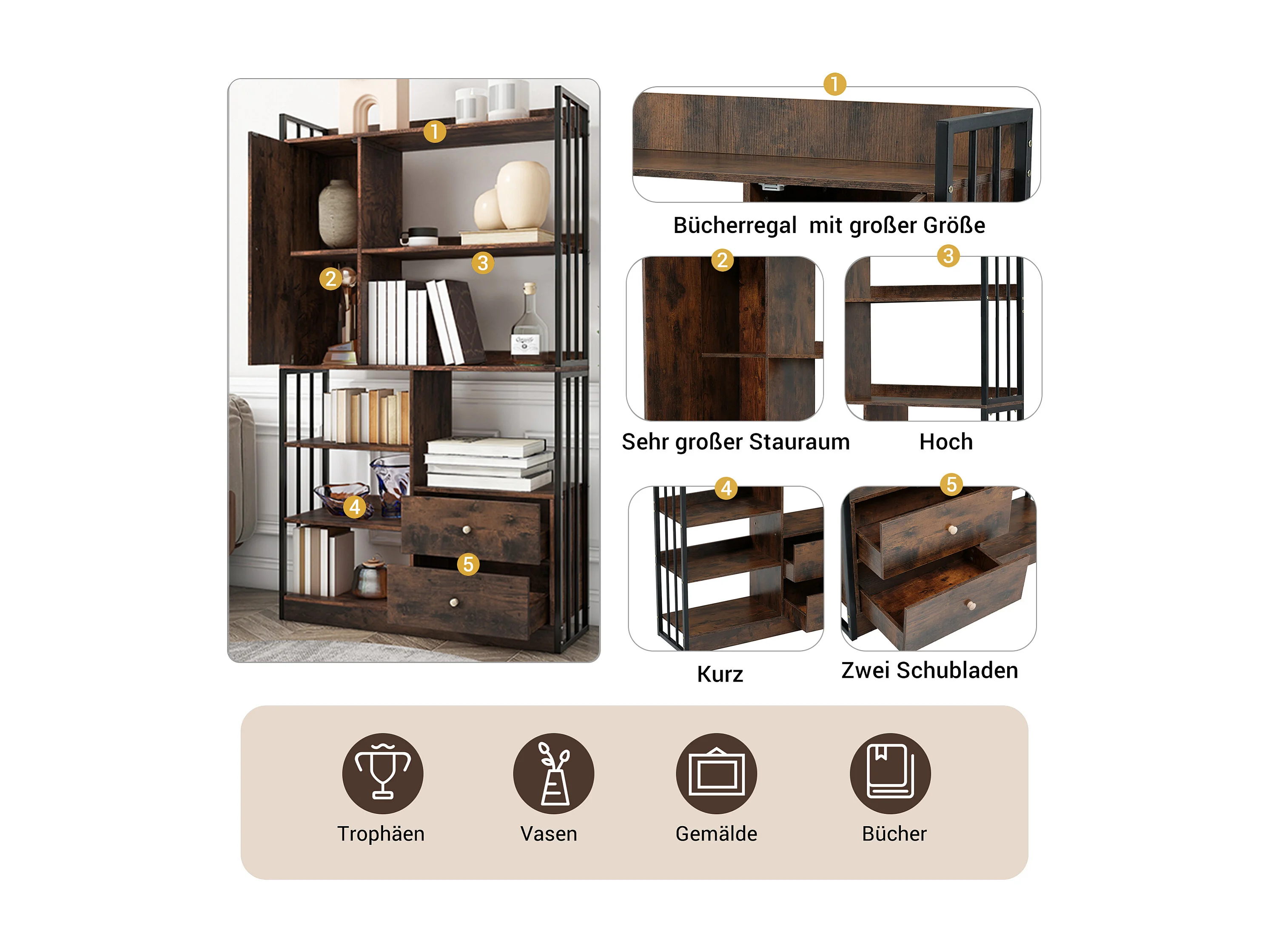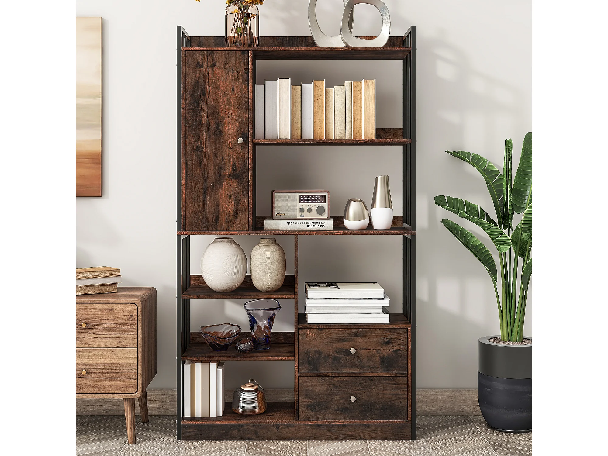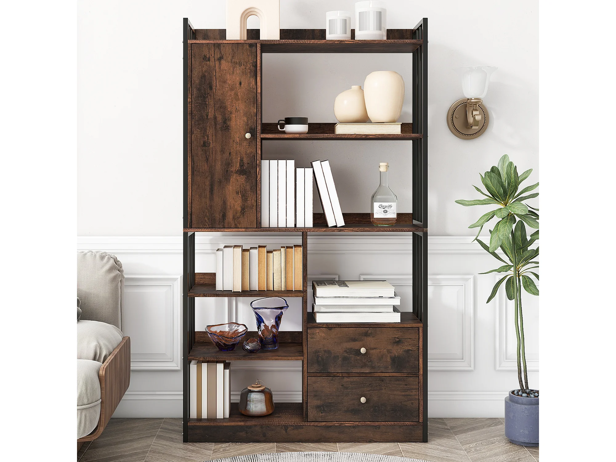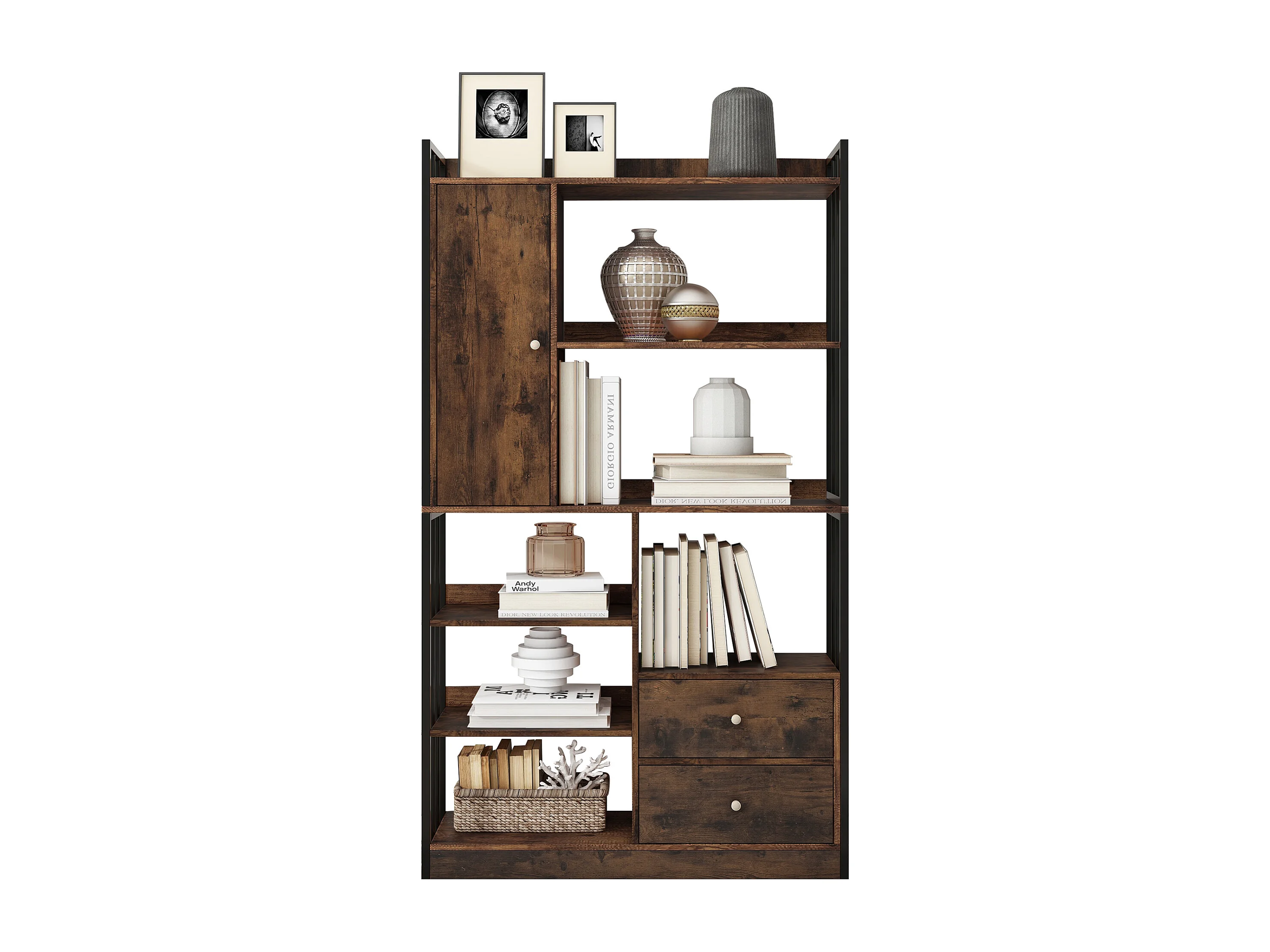 Industriële boekenkast met 6 planken, planken met deuren en laden, staal, antiekbruin (100x30x173,5 cm)