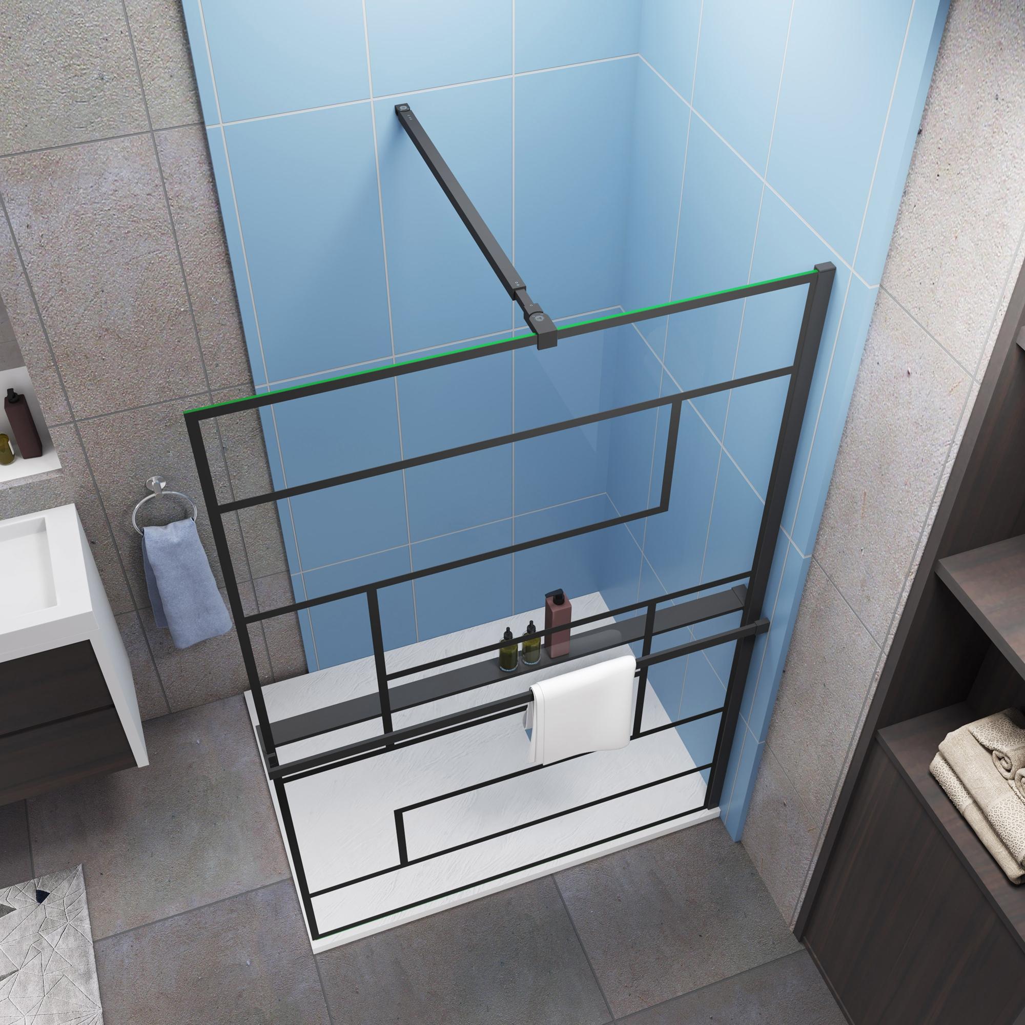 Industriële inloopdouchewand 120x200cm-Regelmatig blokpatroon-8mm easy clean glas-planchet-F-stabilisatiestang 90cm-Snijbaar-mat zwart