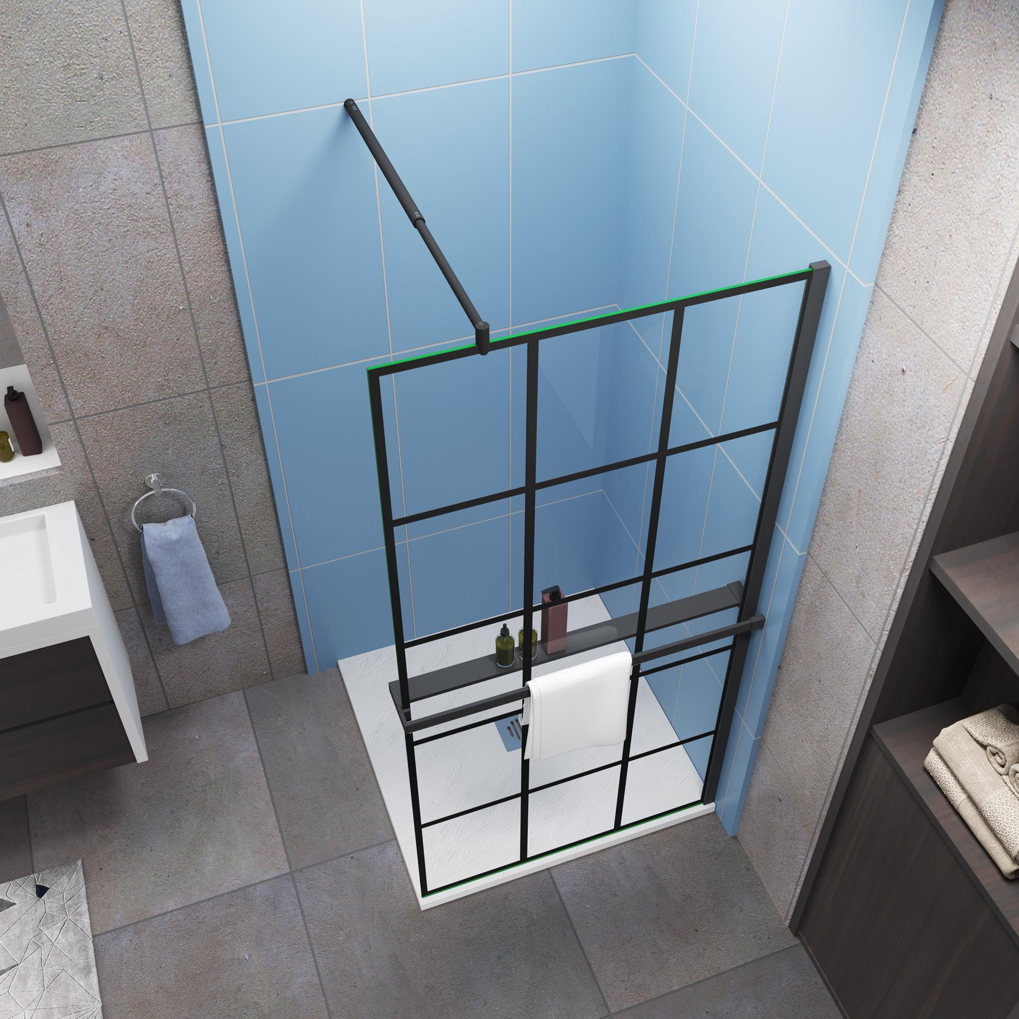 Industriële inloopdouchewand 80x200cm-Regelmatig blokpatroon-8mm easy clean glas-planchet-F-stabilisatiestang 90cm-Snijbaar-mat zwart