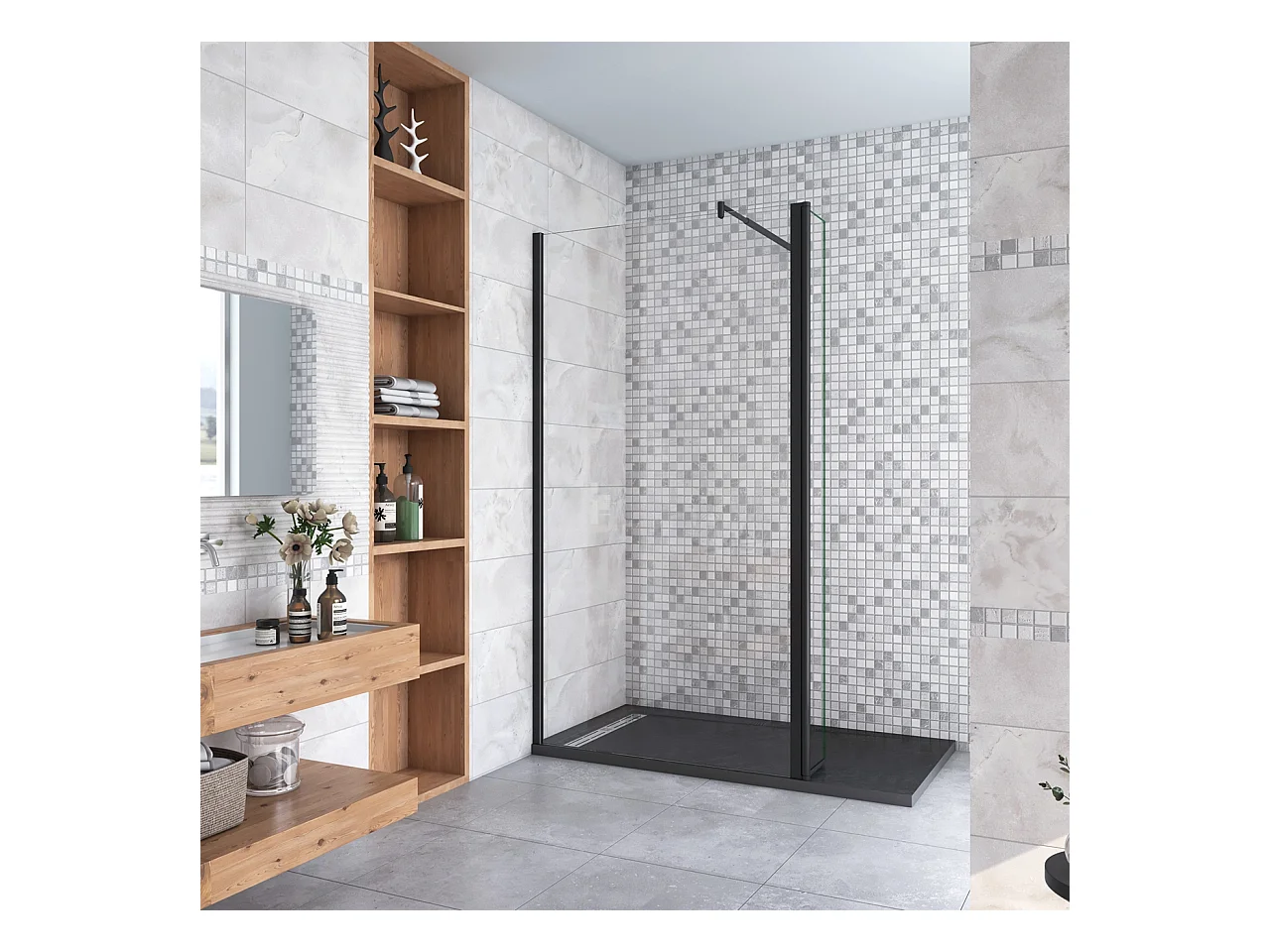 Inloopdouche-douchewand-walk in 8mm NANO EasyClean veiligheidsglas,70x200cm+30x200cm draaibaar hoekprofiel+73-120cm Stabilisatiestang,mat zwart aluminium profiel.