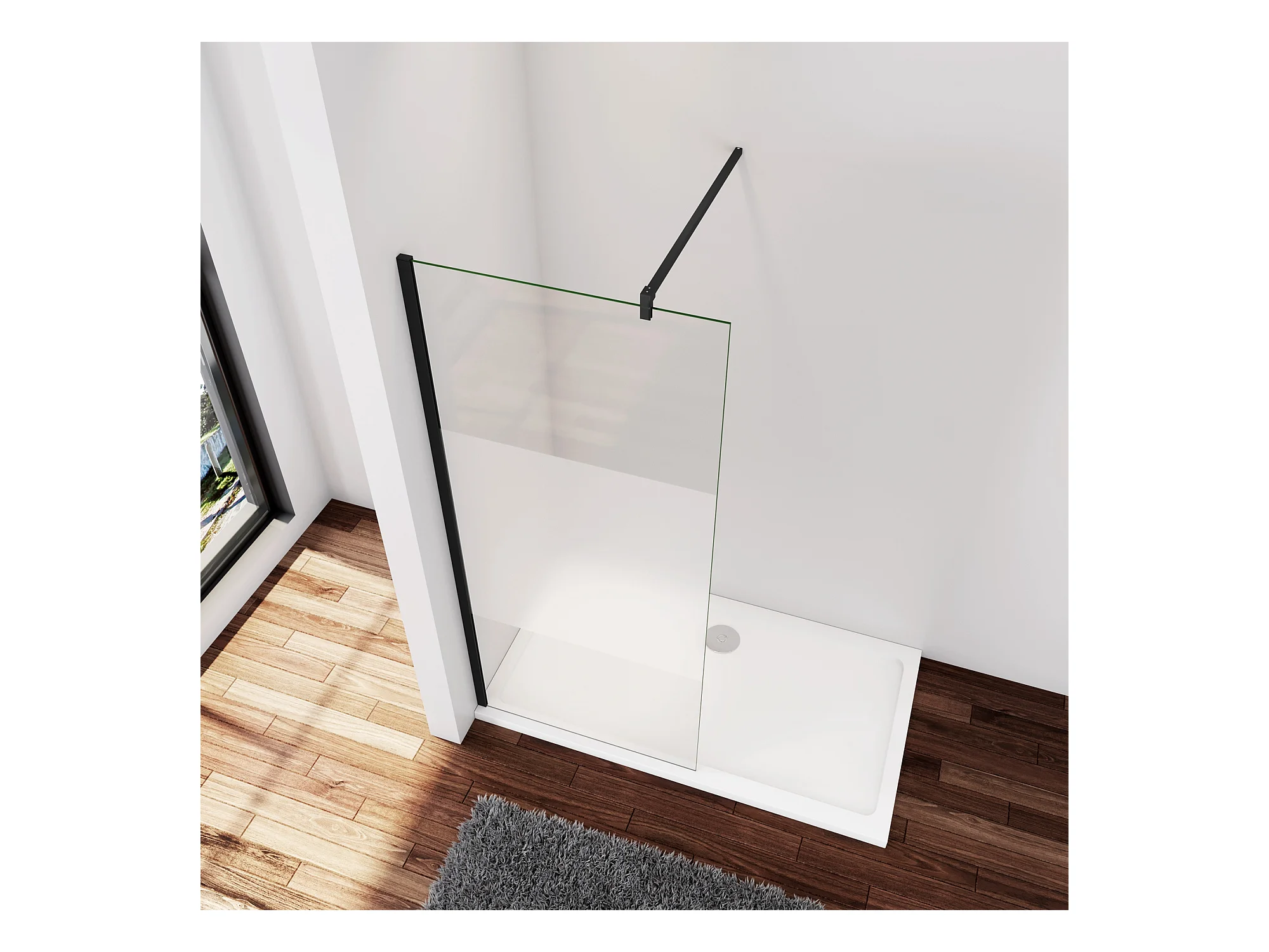 Inloopdouche-douchewand-walk in 120x200 cm,10mm midden wit gematteerd gehard glas met explosieveilige folie+73-120cm Stabilisatiestang,mat zwart aluminium profiel.