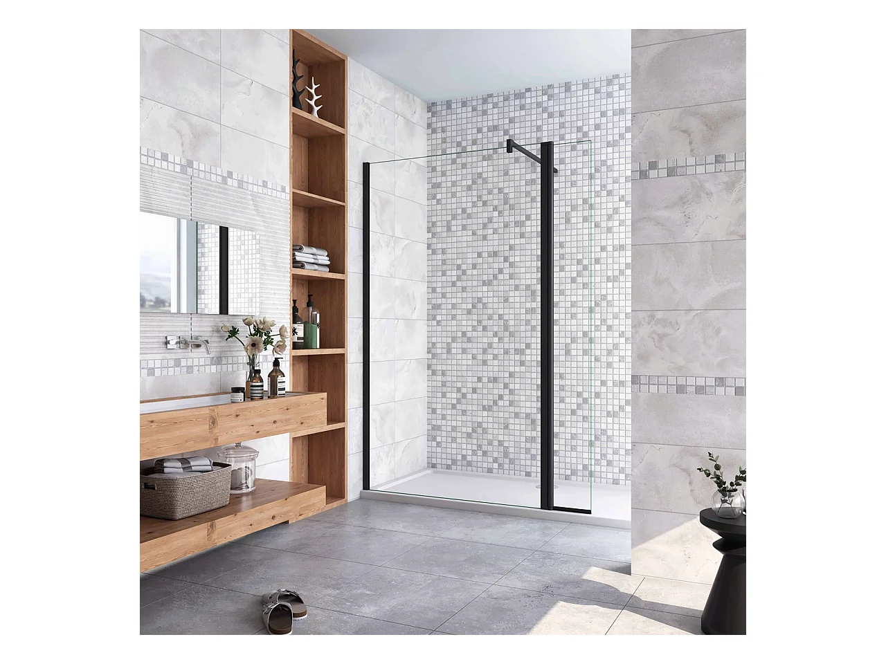 Inloopdouche-douchewand-walk in 8mm NANO EasyClean veiligheidsglas,60x200cm+30x200cm draaibaar hoekprofiel+70-120cm Stabilisatiestang,mat zwart aluminium profiel.