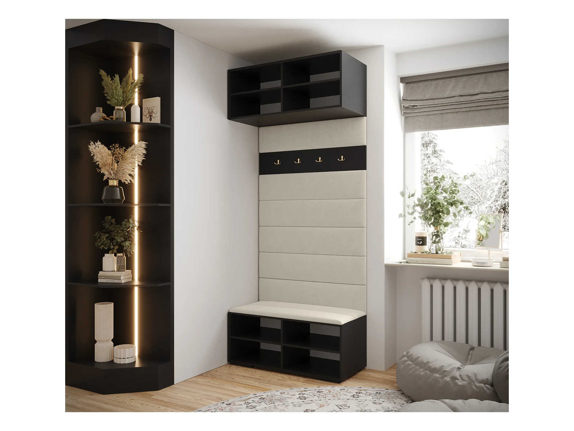 Zwarte kapstok met 6 gouden haken en 3 deuren - opbergbank en 3 open vakken