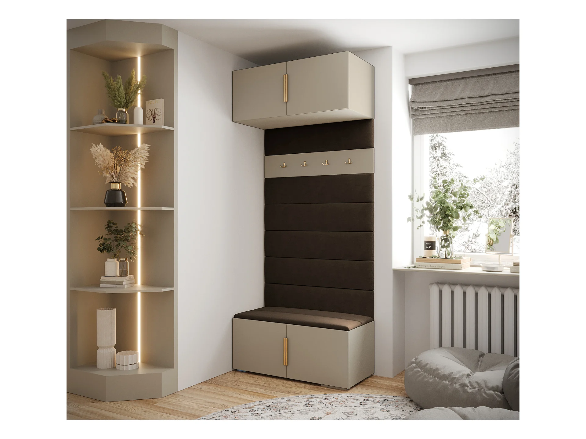 Dmartíne entreekast, Hanger ingang, Compositie voor atrium, Multifunctionele opbergconsole, 137x35h55 cm, Tortora en Antraciet