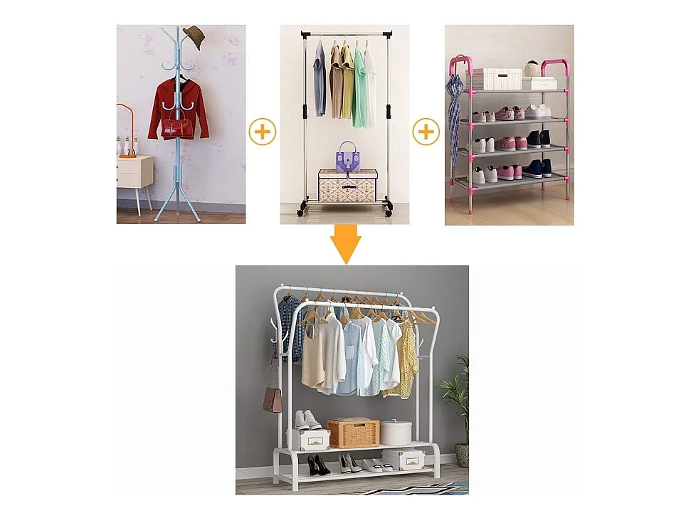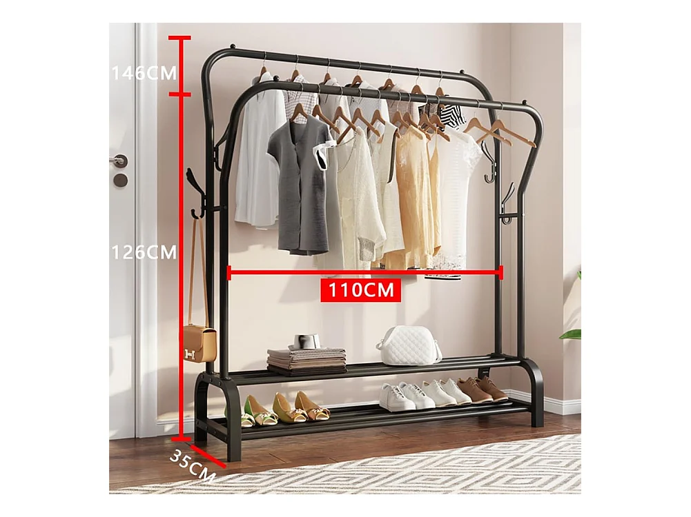 Kapstok Dubbel Kledingrek met Schoenenplank 4 Haken Garderobe,110x35x146cm - Zwart