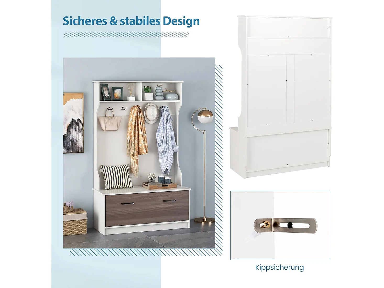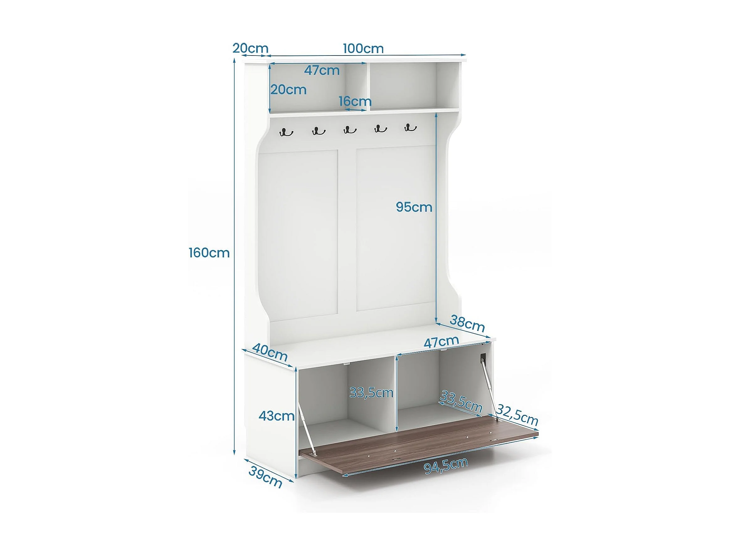 Kapstok met zitbank en 5 dubbele haken, garderobe met open vakken en schoenenkast, halgarderobe voor entree, slaapkamer, 100 x 40 x 160 cm (wit)TG32660