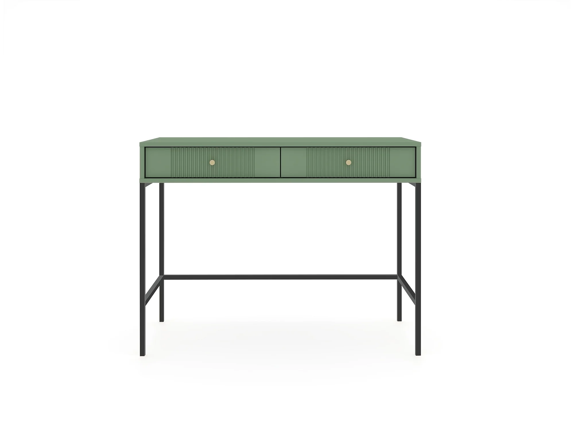 Geriffelde kaptafel met gouden handgrepen, Stalen frame, MDF bureau, 2 lades, Gesculpteerde voorkant, 104x78x50 cm, Mat labrador, Zwarte metalen poten